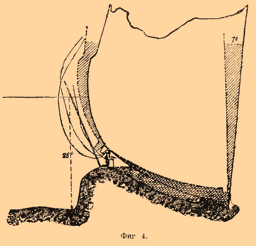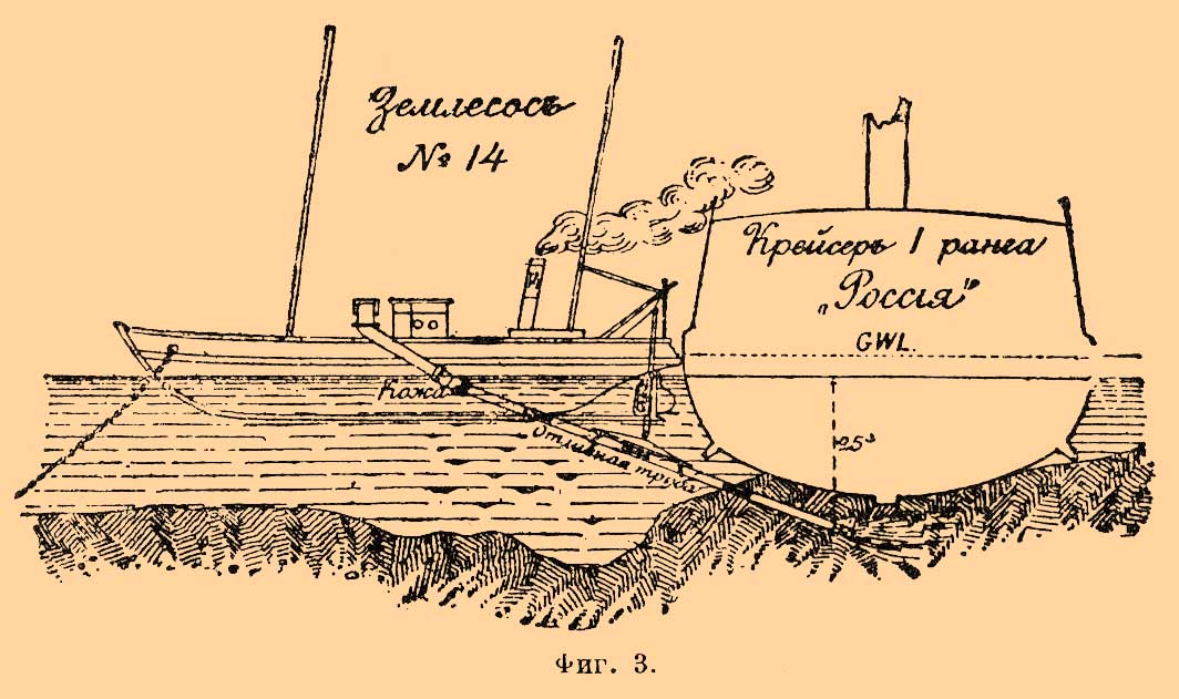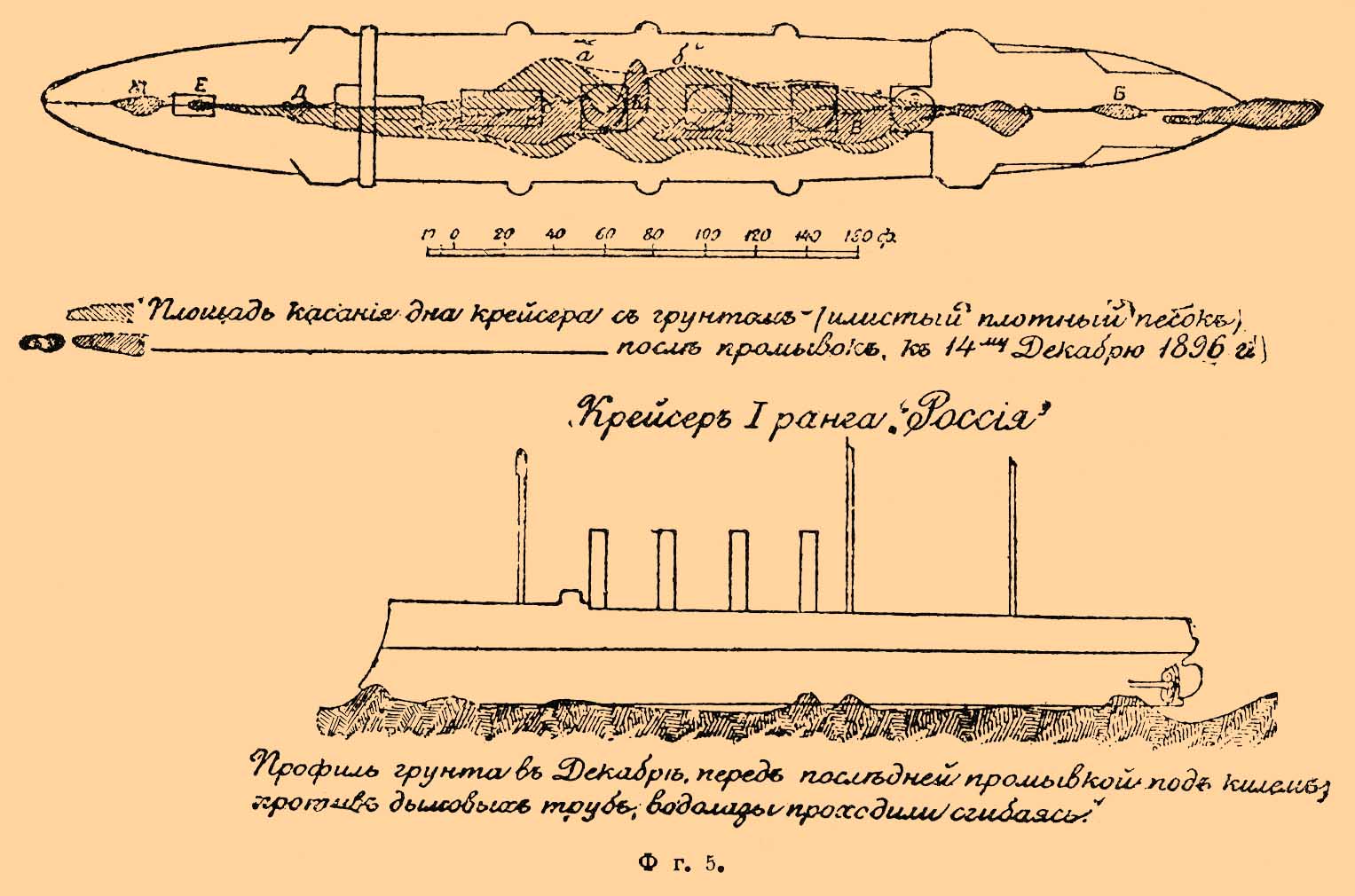 Кроме того, разрыхление грунта и вымывание его водой обнаруживалось как изменением дифферента (т. е. крейсер постепенно садился кормой или носом, смотря по тому, где работал землесос), так и креном, достигшим 7½° на левый бок. Фиг. 4 представляет осмотр с правой стороны крейсера, когда он накренился на левую сторону на 7° и сел на 2½ фт.; пунктиром изображено прежнее положение.