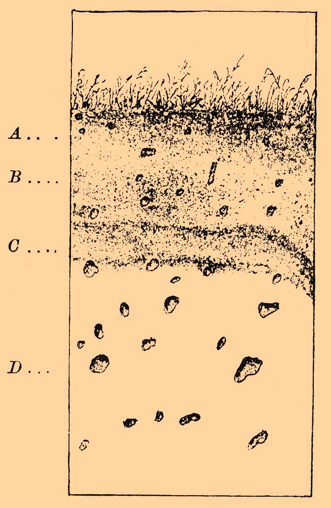 Кремнезем типичного П. находится здесь главным образом в аморфном состоянии. Число кварцевых зерен зависит, по-видимому, исключительно от петрографического характера подпочвы; в подзолистых супесях и песках оно может быть значительным и даже преобладающим. Благодаря почти полному отсутствию перегноя, щелочей, фосфорной кислоты и других питательных веществ, а также слабой поглощательной способности П. считается почвой крайне неплодородной, без значительного удобрения (опыты Энгельгарда). По своему механическому составу П. относятся к разряду почв мелкоземистых: преобладают частицы диаметром от 0,01 до 0,05 мм (около 50%). В связи с этим стоят и его физические особенности — чрезвычайно слабая водопроницаемость, значительная влагоемкость, быстрая испарительная способность, теплопроводность и др., особенно по сравнению с горизонтами А и D (см. ниже), как это показывает, напр., физико-механический анализ (Георгиевского) подзолистого суглинка из села Лазаревичи Тихвинского уезда Новгородской губернии.