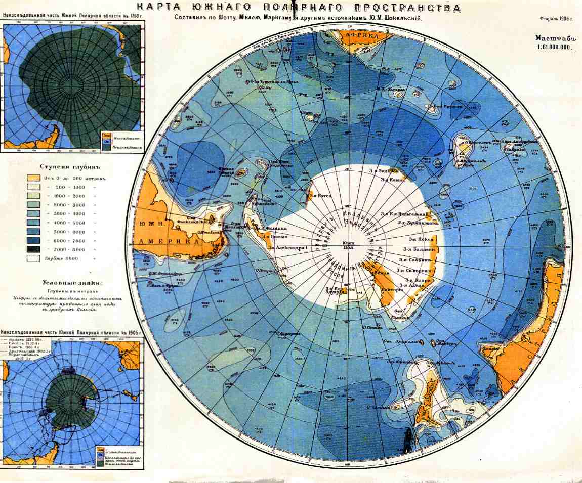 3) Южный Ледовитый океан. — Глубины за последнее десятилетие обследованы значительно подробнее. Поэтому на новой карте, приложенной здесь, рельеф дна выражается совершенно иначе, нежели на старой (см.).