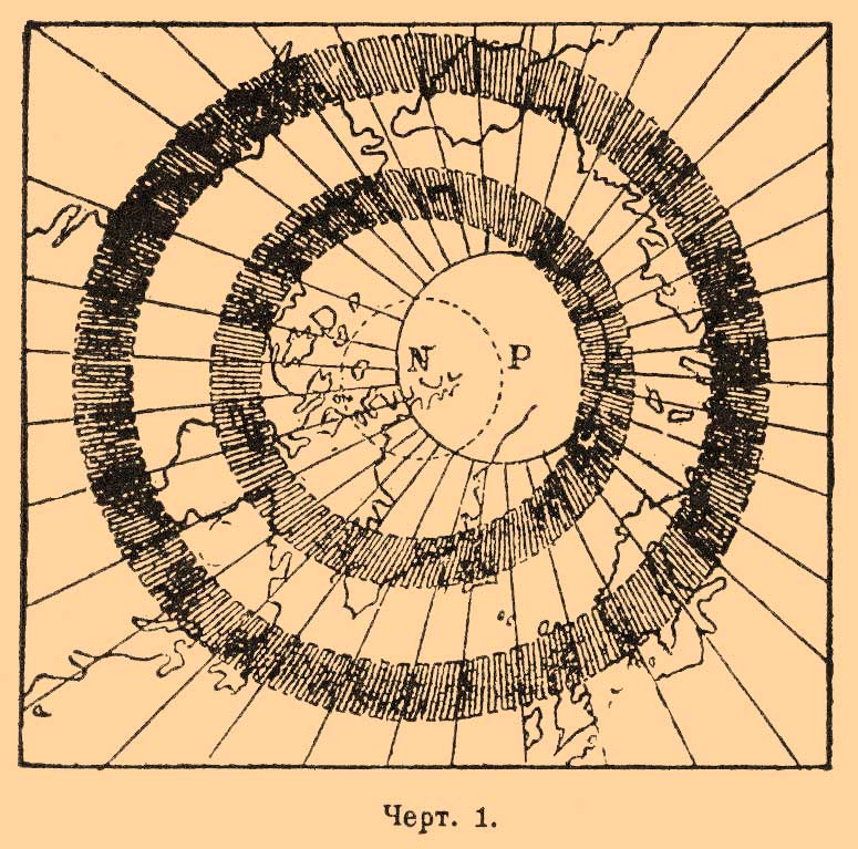 На этой карте все места с одинаковым средним числом сияний, наблюдаемых в течение года, соединены сплошными линиями, — изохазмами (ίσος — равный, χάσμη от χάσχω — зияю, разверзаюсь). Изохазмы представляют собой овальные, довольно правильные линии, центр которых — Норденшёльдов пункт, совпадающий почти с северным магнитным полюсом, — является полюсом северных сияний. Первая, внешняя из этих линий, помеченная цифрою 0.1, соединяет места, где полярные сияния наблюдаются в среднем однажды в 10 лет. Внутри области, ограниченной этой линией, повторяемость быстро растет: в Петербурге наблюдается, напр., средним числом 9 сияний в год, в Христиании — около 30, в Дронтгейме и Улеаборге — около 100. С приближением к полюсу сияний повторяемость их возрастает, однако, только до тех пор, пока мы не дойдем до линии, обозначенной на карте линией максимума; по ту сторону этой линии число сияний снова уменьшается. Одновременно с уменьшением повторяемости уменьшается и яркость сияний к С от этой линии. Вместе с тем обнаруживается и еще странный факт. В средних широтах Европы П. сияния наблюдаются почти исключительно на северной части небосклона; только в исключительных случаях светлая дуга сияния переходит через зенит наблюдателя и может быть видима на южной стороне горизонта. При переходе к более сев. местностям, с увеличением числа сияний в течение года возрастает и число сияний, наблюдаемых на южной стороне горизонта. За линией максимальной повторяемости на карте проведена еще одна пунктирная линия (полоса нейтрального направления), соединяющая все места, для которых число сияний, наблюдаемых на северной стороне горизонта, равно числу сияний на южной. Севернее этой линии преобладают уже сияния на южной стороне горизонта: так, в Упернавике (Гренландия) из 100 сияний 81 видно на южной половине горизонта и только 4 на северной его стороне, остальные же 15 появляются то на В, то на З. Сопоставляя эти факты со своими наблюдениями во время путешествия около северных берегов Азии, т. е. в районе максимальной повторяемости сияний, где почти постоянно можно было наблюдать спокойно стоящую высоко над горизонтом двойную светлую дугу П. сияния, Норденшёльд высказал гипотезу, довольно удовлетворительно объясняющую наблюдаемые факты. Он предполагает, что вокруг северного магнитного полюса (правильнее Норденшёльдова пункта) существует постоянное световое кольцо (венец северных сияний) диаметром около 2000 км и на высоте около 200 км над поверхностью земли; снаружи этого кольца, в его плоскости, лежит второе, несколько большего диаметра; высоты наблюдаемых дуг довольно хорошо соответствуют этой гипотезе Норденшёльда. Эти кольца наблюдатели и видят, как светлые дуги, то на северной, то на южной стороне горизонта, смотря по положению места наблюдения относительно колец. Из внешнего кольца, которое Норденшёльд считает центром световой деятельности для сияний, появляются все яркие и более сложные формы явления, направляясь наружу; в области же между внутренним кольцом и полюсом сияний наблюдаются только сравнительно слабые и простые типы последних. Гипотеза Норденшёльда вызвала, впрочем, против себя довольно веские возражения.