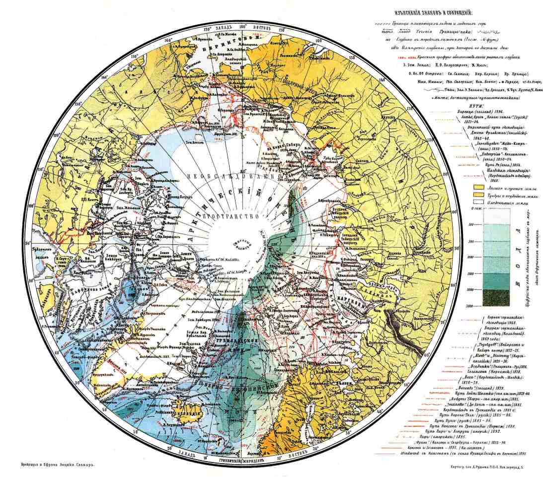Литература очень обширна. Позднейшую библиографию см. у Chavanne, "Die L iteratur ü ber die Polar-Regionen der Erde" (Вена, 1878; содержит 6617 названий). Дальше указываются лишь наиболее важные, тем более, что до 1878 г. почти все есть у Шаванна; у него плохо разработаны только русские источники. Можно также найти много данных в "Dictionnaire de g é ographie" Vivien de St. Martin, в "Manual of the natural history, geology and physics of Greenland and adjacents regions" (Л., 1875); в разных "Parliamentary Papers". См. Guely, "Handbook of arctic discoveries" (Бостон, 1897); W. Scoresby, "An account of the Arctic Regions with a history and description of the Northern whalfisbery" (Эдинбург, 1820); С. Markham, "The treshold of the unknown Region" (Лондон, 1874); E. Murray, "Arctic expeditions from british and foreign shores etc." (Эдинбург, 1877); Hellwald, "Im ewigen Eise. Geschichte der Nord-polarfahrten etc." (Штутг., 1879; рус. пер.); "Contributions to our knowledge of the meteorology of the Arctic Regions" (Л., 1879—88); Mac-Cormick, "Voyages of discovery in the Arctic and Antar c uc seas etc." (Л., 1884); Brown, "The Northwest Passage" (Лондон, 1860); Peterman'a "Mittheilungen" за все года; "Proceedings" и "Geographical Journal" лондонского географического общества. Весьма хорошая история исследований берегов Сибири у Норденшёльда, "Voyage de la Vé ga" (П., 1883—84). Изложение русских путешествий — в "Beitr ä ge zur Kentniss des Russisches Reiches", затем в изданиях морского мин., главным образом: "Записки Адмиралтейского Департ.", "Записки Гидрографического Дпт.", "Записки по Гидрографии", "Морской Сборник": все эти издания имеют подробный указатель статей. См. также Берг, "Хронологическая история всех путешествий в сев. П. страны и т. д." (СПб., 1821 и 23); "Путешествие Сарычева по сев.-вост. части Сибири" (СПб., 1802); Коцебу, "Путешествие в Южн. океан и Берингов прол." (СПб., 1821—23); Берг, "Первое морское путешествие россиян для решения географической задачи: соединяется ли Азия с Америкой" (СПб., 1823); Литке, "Четырехкратное путешествие в Сев. Ледовитый ок. в 1821—24 гг." (СПб., 1828); Врангель, "Путешествие по сев. берегу Сибири 1820—24 гг." (СПб., 1841); его же, "Прибавление" к предшествующему (СПб., 1841); вообще до 1882 г. включительно см. "Русская морская библиография с 1701—1882 г." (СПб., 1885); позже см. издания обществ: Имп. Географического, Имп. для сод. рус. торг. и пром." (Москва) и его отделения в СПб., "Русское Судоходство", "Отчет Главн. Гидр. Упр." морского мин-ва и др. Лучшая карта при опис. путеш. Нансена (на нем. и англ.).
