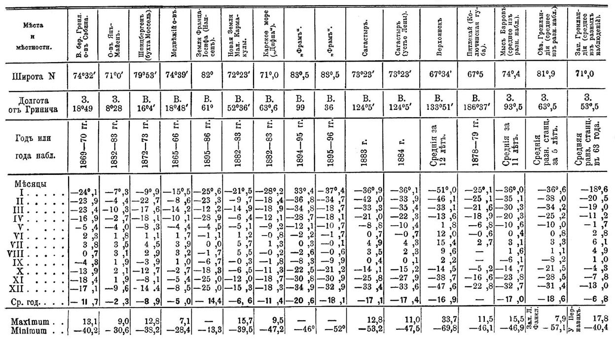 Климат. Лето, вообще прохладное и короткое, зима длинная и с температурами немного выше тех, которые встречаются зимой среди наиболее обширных континентов. Среди Сев. Ледовитого океана, к С от 81° с. ш., как показывают наблюдения Нансена, только средняя температура воздуха в июле немного выше 0°, в остальные же летние месяцы она ниже 0°, следовательно лето тут холоднее, нежели где-либо на сев. полушарии, зима же только немного теплее наиболее низких температур, наблюдаемых в вост. Сибири и, вероятно, также среди Гренландии, где надо ожидать наиболее низких температур в сев. полушарии. Действительно, средняя температура зимних месяцев, наблюдавшаяся на "Фраме", не спускалась ниже — 37,4°С, тогда как в Верхоянске в сев.-вост. Сибири, с ноября по февраль включительно, средняя месячная температура воздуха ниже — 38°С и доходит до — 51°С, а на СВ Земли Гриннеля до — 41°С. Точно так же и крайние наименьшие темп. в Верхоянске доходят до — 69°С, на Земле Гриннеля до — 52°С; на "Фраме" не наблюдали ниже — 52°С. Вообще наибольшие холода случаются в феврале и марте, а самый теплый месяц — июль; осень вообще теплее весны. Суточный ход температуры круглый год и особенно зимой мал; вот каков он для 73° параллели в среднем (по Ганну).