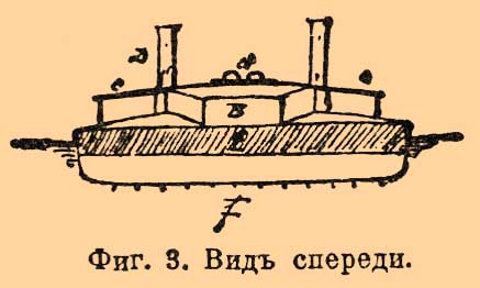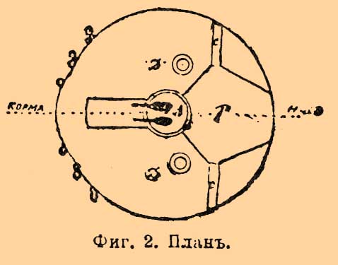 — тип русского броненосца круглой формы, проектированного и построенного по идее и под руководством вице-адмирала Попова и названного по его имени. П. имеются две: "Новгород" (1873) и "Вице-Адмирал Попов" (1875), обе черноморского флота и состоят в списке броненосцев береговой обороны. На фиг. 1, 2 и 3 [Объяснение фиг. 1, 2 и 3. А — башня с двумя орудиями большого калибра; В — рубки для офицеров; С — мостик; D — дымовые трубы; Е — заштрихован по яс бортовой брони; F — кили днища.] показан эскиз П. "Новгород". Форма корпуса его — небольшой высоты цилиндр с круглым основанием; диаметр — 101', углубление в воде 12,5', водоизмещение — 2491 тонна. Палуба выпуклая, возвышающаяся над водой у бортов 1,5', покрыта броней толщиной от 2" до 3". Бортовая броня толщиною 9".