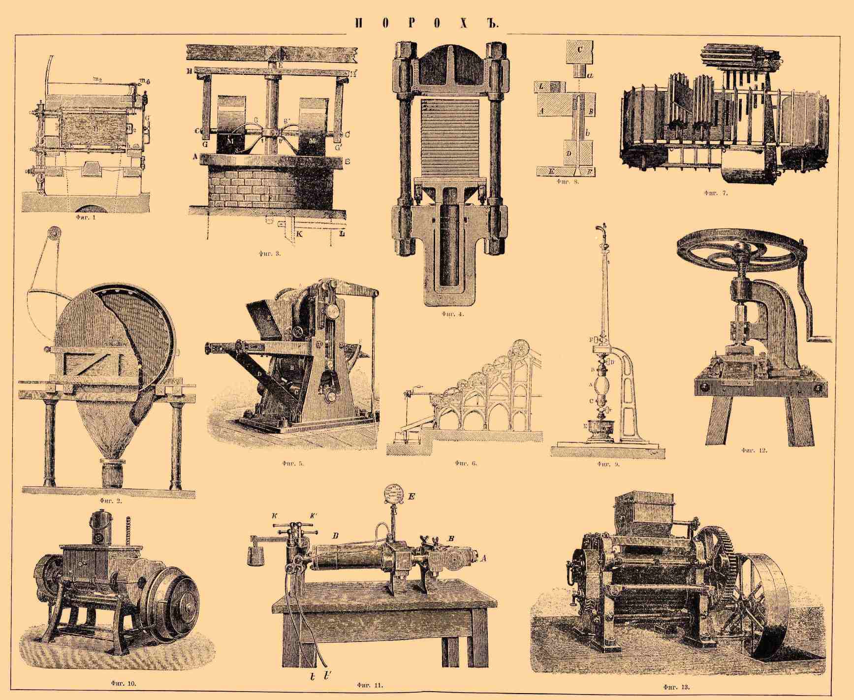 1) Пироксилиновый бездымный порох Вьеля впервые был введен для военной стрельбы во Франции в конце 80-х г. Подробности его фабрикации удерживаются в секрете, но, судя по общим сведениям и опытам, произведенным вслед за тем в других государствах, можно с положительностью утверждать, что сущность этой фабрикации состоит в следующем. Берут смесь высоконитрованной клетчатки с 13,0% (ок.) азота и низконитрованпой с 11 — 12% азота (см. Нитроклетчатка) в такой пропорции, чтобы полученное смешение содержало определенное количество азота и в то же время было способно превращаться в плотные коллоидальные формы при содействии летучего растворителя. Содержание азота в смеси, смотря по назначению приготовляемого пороха и натуре применяемого растворителя в различных государствах, изменяется приблизительно от 12,0 до 12,75%; более обыкновенная величина его 12,5%. Пропорция растворимой нитроклетчатки в смеси, смотря по принятому растворителю, варьирует, от 20 до 50%; когда растворитель есть смесь спирта (1 об.) с эфиром (2 об.), то эта пропорция большей частью бывает от 40 до 60%. Оба вида нитроклетчатки, обыкновенно, берутся в измельченном виде (мезга). После высушивания смесь подвергается так наз. желатинации посредством малого количества того или другого летучего растворителя, беря последнего от 100 до 200 частей на 100 частей сухой мезги. При размешивании в герметически закрытых мешалках в течение от 2 до 4 час. масса получает консистенцию весьма крутого теста, разделенного на более или менее мелкие комочки, которые при сжимании способны превращаться в плотные полупрозрачные пластинки. Очевидно, в этих пластинках нетронутые растворителем волокна нитроклетчатки будут проникнуты и склеены густым раствором других ее волокон. Масса имеет тогда вид и консистенцию не вполне отвердевшего клея или желе (откуда и само название этой операции — желатинация). Комочки полученного крутого теста затем превращаются посредством прессования в те или другие формы П. Наиболее употребительные формы пластинчатые, причем отдельные зерна П. имеют вид или равносторонних квадратов, или более или менее удлиненных лент; реже применяются цилиндрические формы с каналом по оси, или так назыв. макаронные. Отпресованный П. остается после того только высушить, подвергая его действию свободно меняющегося воздуха, сначала при обыкновенной температуре и окончательно при нагревании не выше 50°. По мере улетучивания растворителя П. сокращается в объеме, более и более уплотняется и в то же время делается тверже, но сохраняет свою упругость и большое сопротивление разрыву. В окончательно высушенном пироксилиновом П. всегда остаются небольшие количества неудаленного растворителя, который, однако, может выделяться медленно при долгом хранении П., вследствие чего последний всегда издает более или менее слабый запах, свойственный растворителю. Если растворителем служила спирто-эфирная смесь, совсем не действующая на нерастворимую нитроклетчатку, то в результате такого медленного высыхания можно опасаться расстройства плотного коллоидального строения форм вследствие обособления в их массе не тронутых растворителем волокон. Отсюда преимущество ацетонного растворителя, так как он растворяет оба вида нитроклетчаткн, входящие в смесь. Но с 1892 г., благодаря исследованиям научно-технической л