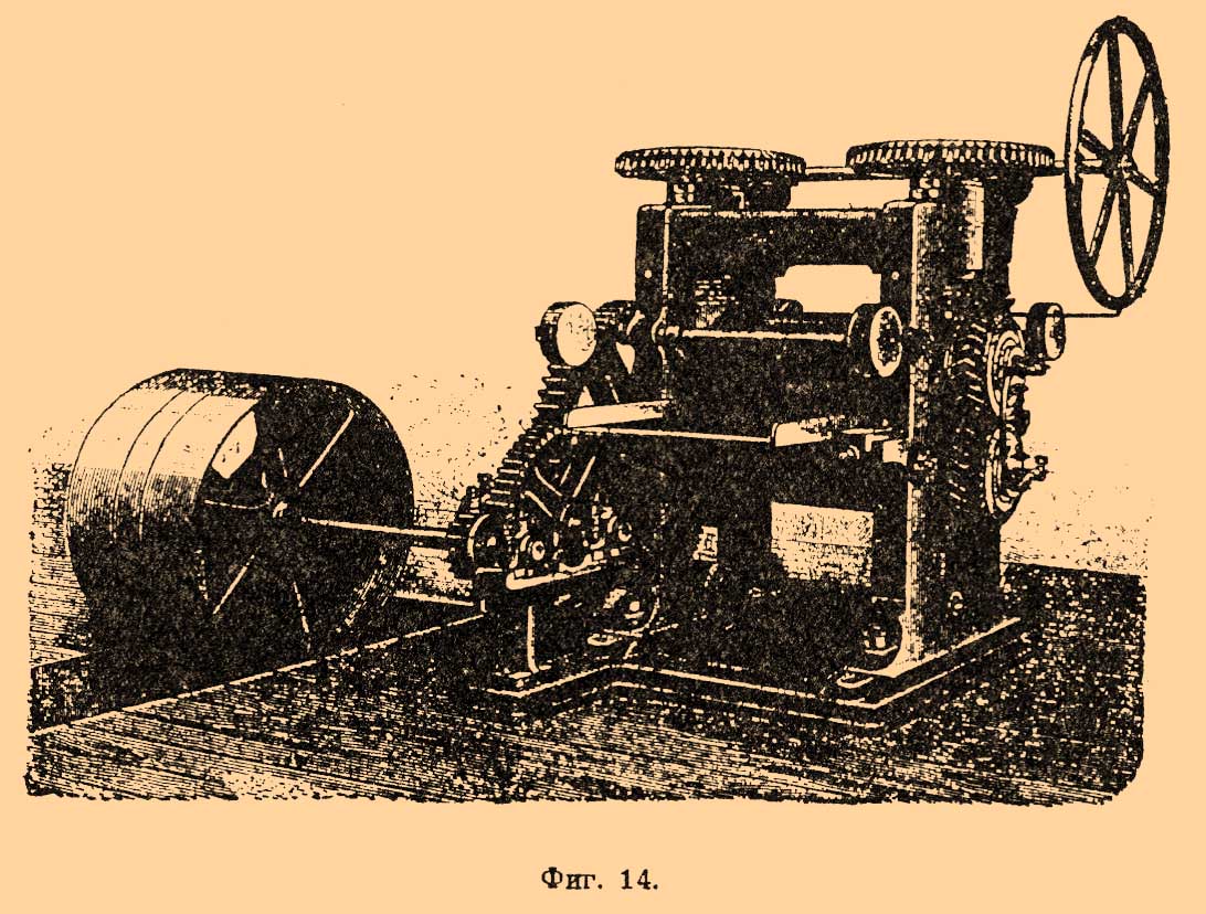 Если приготовляются сорта П., требующие большей толщины пластинок, то прозрачные тонкие листы складываются в несколько слоев и медленно пропускаются между теми же вальками так, чтобы воздух, попадающий между слоями, постоянно удалялся. Полученные большие листы затем подвергаются резке. С этою целью для получения равносторонних пластинок применяются машины, подобные изображенной на фиг. 15.