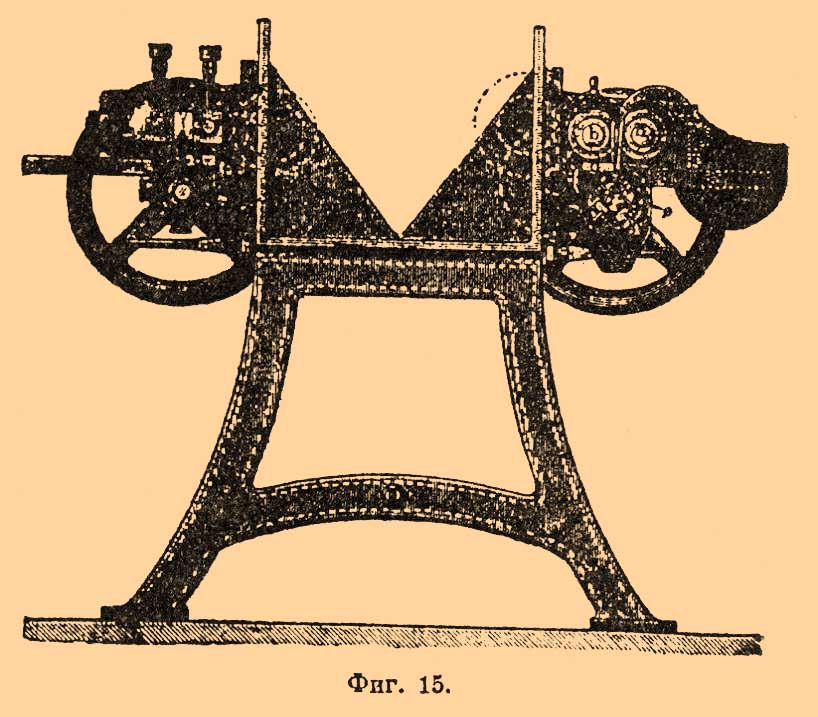 На одной и той же подставке установлены собственно два резательных аппарата. В каждом на двух параллельных вальках bb1 насажены круглые ножи а, разделенные между собой кольцами меньшего диаметра. Широкий лнст П., проходя между этими ножами сверху, разрезается на длинные более узкие ленты. Последние по ведущей щели спускаются к выступу d и здесь, входя в нижнюю часть аппарата, действием колесного ножа е разрезаются поперечно на части равной длины. Колесный нож состоит из двух крестообразно прикрепленных к оси пластинок, к ребрам которых приделаны режущие стальные пластинки (по поверхности описанного цилиндра). При получении удлиненных пластинок листы сырого П. в подобных же машинах разрезаются только продольно, причем круглые ножи промежуточными кольцами раздвигаются на большее расстояние, а поперечное разрезание производится отдельно резаком (гильотиной). Во время выполнения всех этих операций вальцования и резки главная масса растворителя, содержавшегося в желатинированном тесте, постоянно испаряясь в окружающий воздух, безвозвратно теряется. Окончательная сушка производится обыкновенно в струе теплого воздуха на полотняных лотках в сушильных шкафах с температурой не выше 50°. Удаление растворителя достигается в большей мере, если высушивание перемежается с вылеживанием при обыкновенной температуре в течение более или менее значительного времени. По выходе из сушильни, П. напитывается воздушной влажностью до 0,5 — 1%, после чего подвергается еще мешке, для придания партиям однородности в отношении состава и свойств. При фабрикации пироксилиновых сортов пороха французского типа эта операция имеет большее значение, чем для пироколлодийного П., так как в первых, кроме всех прочих условий неоднородности, имеет место еще различие в составе самого смешения мезги коллодия и нерастворимого пироксилина. Готовые партии обыкновенно сохраняются в герметически укупоренных ящиках. Пластинки пироколлодийного пороха обладают большей прозрачностью, чем пластинки пироксилинового. Толщина их для различных орудий варьирует от 0,25 мм до 4,0 мм. Содержание не удаляемого при сушке спирто-эфирного растворителя возрастает с толщиной и изменяется от 2% до 7%. Но так как крайне медленное выделение его все-таки имеет место даже при обыкновенной температуре (см. выше), то это обстоятельство и обусловливает хранение П. в герметической укупорке, ибо в противном случае с течением времени может произойти перемена его состава. Уд. вес пластинок тем больше, чем меньше содержание остаточного растворителя, и изменяется обыкновенно в пределах от 1,64 до 1,55. Если пластинки, втянувшие 0,5 — 1% воздушной влажности, оставить лежать на открытом воздухе, то перемену веса можно заметить лишь по прошествии долгого времени. Под колоколом над водой при обыкновенной температуре количество поглощенной влажности в пределе доходит до 3%. При погружении в воду на несколько суток, после обсушки между листами пропускной бумаги и лежания на воздухе в течение 1/2 часа, привес получается также в 3%. Предельное количество поглощаемой воды зависит отчасти от содержания остаточного растворителя. Принимают, что сорта, показавшие при пробе Вьеля (см. Нитроклетчатка [Для пробы помещают в цилиндре 10 г измельченного П.]) до красного окрашивания нормальной лакмусовой бумажки стойко