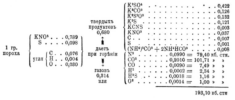 Последующие многочисленные исследования (Craig, Linck, Karolyi, Федоров, Betrthelot, Noble и Abel, Debus) показали, что состав продуктов изменяется в зависимости от давления, под которыми горение П. происходит, а также, — что K 2S2O3 образуется главным образом вследствие окисления K 2S2 при соприкосновении с кислородом воздуха. Главные продукты суть: K 2 СO 3, K2 SО 4, K2S2 (или K 2 S) в твердом остатке и СО 2, СО, N 2 — в газах. С возрастанием давлений пропорция K 2 СО 3, K2S2 и СО 2 увеличивается за счет К 2 SО 4 и СО; кроме того, горение составных частей П. делается более полным. По Дебусу (1882), процесс совершается в две фазы: сначала происходит собственно горение (взрыв), при чем образуются только K 2 SО 4, K2 СО 3, СО 2, N2 и, может быть, СО; во вторую фазу образовавшиеся при горении твердые продукты более или менее восстановляются оставшимися в свободном состоянии частями угля и серы, а именно K 2SO4 углем, K 2CO2 серой, причем получается K 2S2, тем в большей мере, чем медленнее будет происходить охлаждение, т. е. чем больше будет вес заряда. Сарро, беря средние результаты из опытов Нобеля и Абеля над крупнозернистым английским П. (так наз. гальковым, pebble), при плотностях заряжания в прочной бомбе, отвечающих приблизительно обыкновенным условиям применения в орудиях, выражает весовые пропорции главных продуктов горения следующими круглыми числами: