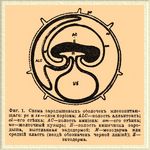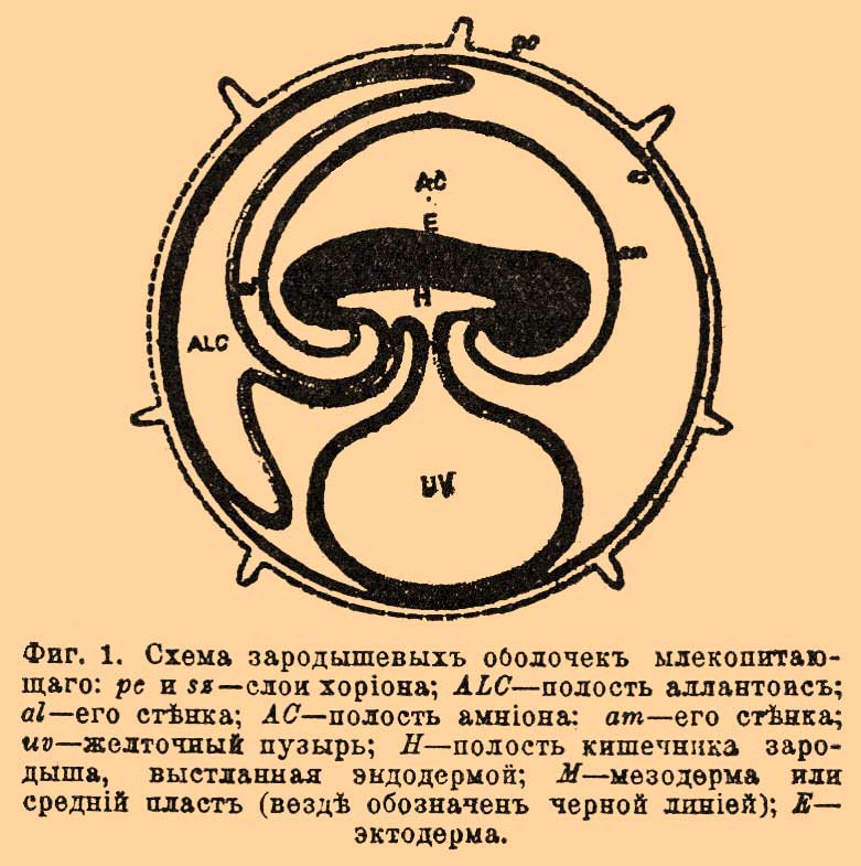 Фиг. 1. Схема зародышевых оболочек млекопитающего: ре и ss — слои хориона; ALC — полость аллантоис; ai — его стенка; ас — полость амниона: am — его стенка; uv — желточный пузырь; Н — полость кишечника зародыша, выстланная эндодермой; М — мезодерма, или средний пласт (везде обозначен черной линией); K — эктодерма.