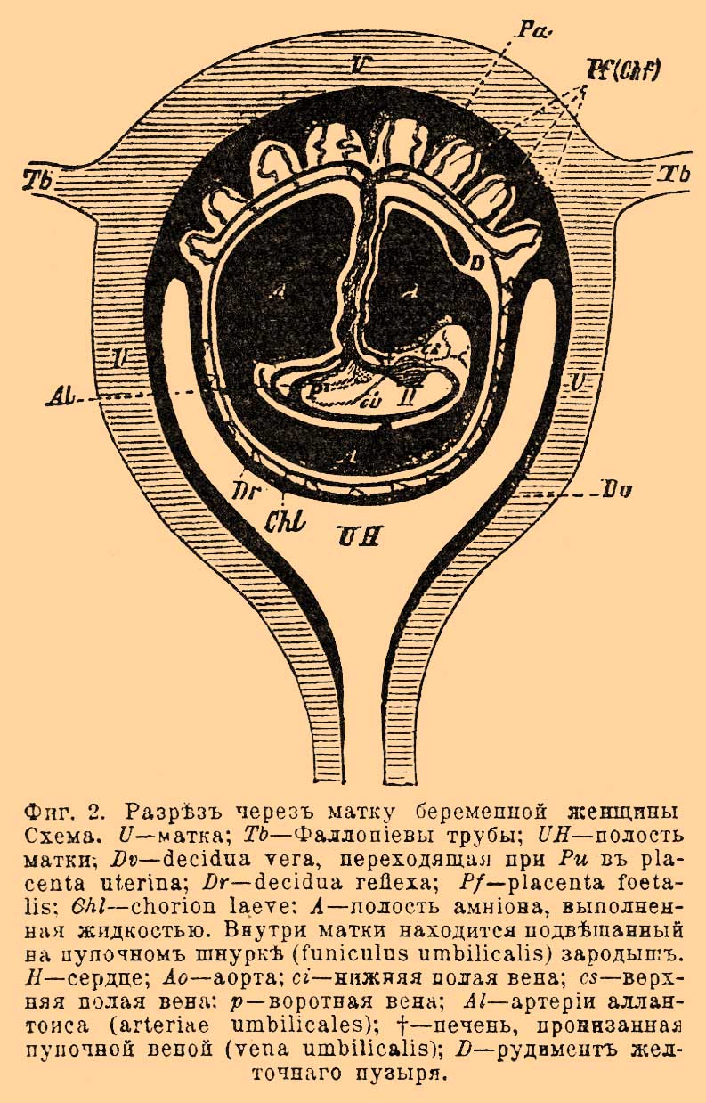 Фиг. 2. Разрез через матку беременной женщины Схема. U — матка; Тb — Фаллопиевы трубы; UH — полость матки, Dv — decidua vera, переходящая при Pu в placenta uterina; Dr — decidua reflexa; Pf — placenta foetalis; Ghl — chorion laeve; A — полость амbона, выполненная жидкостью. Внутри матки находится подвешенный на пупочном шнурке (funiculus umbilicalis) зародыш. H — сердце; аo — аорта; сi — нижняя полая вена; сs — верхняя полая вена; р — воротная вена; Al — артерж аллантоиса (arteriae umbilicales); † — печень, пронизанная пупочной веной (vena u mbilicalis); D — рудимент желточного пузыря.