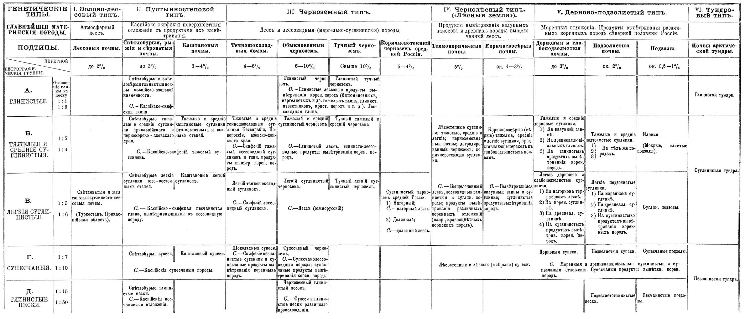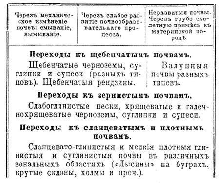 II) Морфологические признаки — цвет, мощность и структура — чрезвычайно важное подспорье при определении П. Цвет их большей частью темный, зависящий от присутствия перегнойных веществ. Интенсивность окраски, в общем, соответствует количеству перегноя и других питательных веществ, за исключением тех случаев, когда П. произошла из темноцветной горной породы (напр., олонецкая черная П., араратская вулканическая и т. п.) или богата сернистым железом. Наибольшей интенсивности темный цвет П. достигает в самом верхнем горизонте, затем книзу окраска бледнеет и постепенно сходит на нет; чаще она однородная, реже — пестрая от включений железа, извести и т. п. Исключение составляют лишь П. болотного и аллювиального происхождения, а также некоторые подзолы и солонцы, где часто бывает нарушена постепенность в окраске. Цвет П. — признак очень важный для систематики, хотя и не всегда надежный, так так меняется в зависимости от освещения, влажности и т. п. Названия многих П. основаны на их окраске: серые земли, каштановые П., чернозем и т. п. Мощностью П. называется толщина всего выветрелого и содержащего перегнойные вещества слоя, от поверхности до материнской породы. На этом протяжении почвенный слой обыкновенно расчленяется на два (редко более) горизонта: верхний — А и переходный — В. Переход в подпочву чаще незаметен, так что мощность П. определяется более или менее приблизительно; только в П. эолового и аллювиального происхождения эта граница обыкновенно резка. Мощность нормальных растительно-наземных П. не превосходит 1—1,5 м, причем, при прочих равных условиях, мощность песчанистых почв значительнее, нежели глинистых. Почти всем девственным (не пахотным) глинистым и суглинистым почвам свойственна особая структура, т. е. способность раcсыпаться на отдельности довольно прочные. По величине диаметра этих отдельностей, разделяют почвы на категории: крупноореховатые — диаметром отдельностей более 7 мм, мелкоореховатые в 7—6 мм, зернистые в 5—3 мм, мелкозернистые — 3—1 мм, пороховидные в 1—0,5 мм, пылеватые — менее 0,5 мм. Иногда структура выражена слабо, иногда же, напр. у девственного чернозема и у лесных суглинков — чрезвычайно резко. Своим происхождением она обязана деятельности корней, червям, растрескиванию при высыхании и т. п. К числу факторов, уничтожающих структуру, относятся, главным образом, распахивание и избыток просачивающейся воды. Структура играет чрезвычайно важную роль в физико-химических процессах, совершающихся в П. и служит довольно надежным указателем при определении П. Кроме указанных, для почвенной систематики важны и второстепенные морфологические признаки: количество и характер песчаных зерен, хряща, гальки, валунов, железистых или известковых включений, присутствие кротовин (нор грызунов), ходов червей, характер растительных и животных остатков и т. п.