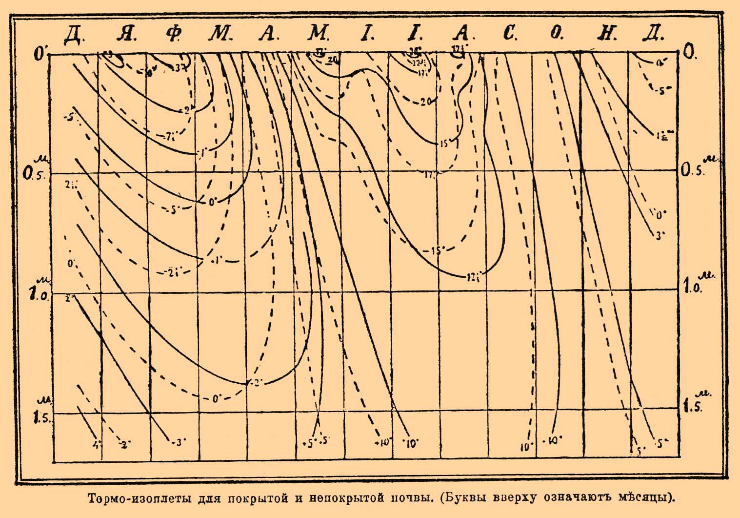 Распространение тепла в П. для какого-либо пункта можно представить графически, откладывая на разграфленной бумаге по горизонтальному направлению время, по вертикальному — глубины. Соединяя на таком графике непрерывной кривой все глубины, имеющие в различные моменты одни и те же температуры, получают систему линий, называемых обыкновенно термоизоплетами. На чертеже такими изоплетами представлен ход температуры на различных глубинах в П. за 1897 г. в Лесном (около С.-Петербурга): сплошными изоплетами изображено распространение тепла в П., сохраняющей свой естественный покров на поверхности как летом,так и зимою; пунктирными линиями — распространение тепла в П., лишенной в течение всего года своего естественного — как травяного, так и снежного покрова.