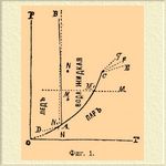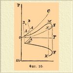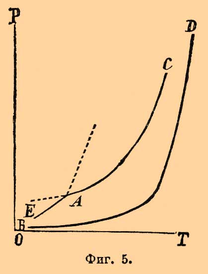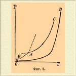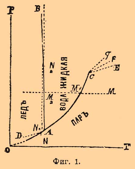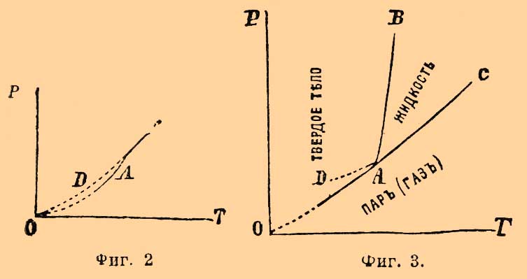 А есть инверсионная точка, в которой может одновременно существовать вода в трех видах (фазах): вода газообразная (вернее, парообразная), вода жидкая и твердая (лед). Температура, отвечающая ей = + 0,0075°С, а давление = 4,57 мм (см. Вода и Лед). Стоит хотя бы незначительно изменить или температуру, или давление, чтобы тотчас вызвать вполне определенное превращение в системе, состоящее в исчезновении одной из фаз. Так, если мы будем уменьшать температуру системы, то исчезнет жидкая вода и останется система из льда и пара; давление испаряющегося льда будет меняться — падать с падением температуры, но так как лед может существовать (ниже точки А) при различных температурах и давлениях, то, очевидно, равновесие между ним и паром должно выражаться кривой АО (фиг. 1); экспериментально она прослежена для очень малого участка температур, теоретические же соображения заставляют предполагать, что эта кривая должна кончаться в нулевой точке координат, т. е. при абсолютном нуле температуры (при — 273°С, Нернст); это обозначено пунктиром. Кривая ОА есть вместе с тем кривая возгонки льда (ср. Пар) или максимального его давления. Диаграмма ясно показывает, что если при постоянной температуре над системой из льда и пара уменьшать давление, то этого нельзя сделать, пока еще остается хоть небольшое количество льда, и только после полного испарения его давление может быть понижено; и наоборот, повышение давления невозможно, пока еще над льдом данной температуры имеется пространство, наполненное паром. Если повышать температуру системы (выше инверсионной точки А), то должна исчезнуть фаза льда, и рассуждениями, вполне подобными только что изложенным, нетрудно прийти к выводу, что кривая АС есть кривая максимальной упругости паров воды в присутствии жидкой воды, т. е. так называемых насыщенных паров (см. Вода). Ниже нее лежиг область пара ненасыщенного или перегретого (см. Вода), непосредственно выше — область жидкой воды. Относительно пограничных точек кривой АС надо заметить следующее. Как показано пунктиром, она может быть экспериментально прослежена на некотором расстоянии ниже точки А, где кривая DA отвечает упругости переохлажденной воды (ср. Лед и Пар), но современные сведения не позволяют решить, отвечает ли ее конец какому-нибудь определенаому физическому изменению воды, или же кривая точно так же должна окончиться в нулевой точке координат (Нернст), т. е. не должна ли диаграмма иметь вид, представленный на фиг. 2. Справа кривая АС имеет, напротив, вполне твердо установленное окончание, и именно абсцисса точки С представляет так называемую критическую температуру воды, а ее ордината давление при критической температуре, т. е. 365° и 200 атм. (Кальете и Колардо). При температурах выше критической жидкая вода нсчезает, превращаясь нацело в газообразную; моновариантная система (вода — насыщенный пар) сменяется, следовательно, дивариантной (критическая точка та, при которой две фазы становятся тождественными; Оствальд), для которой могут быть по произволу выбраны величины давления и температуры, что и показано расходящимися из точки С пунктирными прямыми (фиг. 1), которые изображают наблюденные Кальете и Колардо давления газообразной воды в зависимости от количества ее, подвергавшегося нагреванию; прямой ход их показывает, что и при этих высоких температурах и д