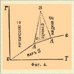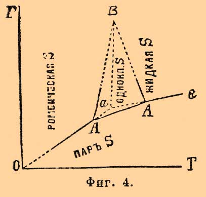 Такова, напр., сера. Для нее с несомненностью (Митчерлих) установлены два аллотропических видоизменения: сера, так называемая октаэдрическая, кристаллизующаяся октаэдрами ромбической системы, и сера призматическая, являющаяся в виде вытянутых призм одноклиномерной системы. Фиг. 4 представляет схематически наблюдаемые тут равновесные системы. При обыкновенной температуре, ромбическая сера является более устойчивым видоизменением и кривая аО представляет собой кривую ее возгонки, аС есть кривая упругости насыщенного пара жидкой серы и, наконец, аВ — кривая, отвечающая моновариантной системе: ромбическая сера + жидкая. Инверсионная точка a (точка плавления ромбической серы) лежит при 114,5° (Броди). При 120° лежит другая инверсионная точка А 1, отвечающая плавлению одноклиномерной серы; в ней сосуществуют: сера одноклиномерная (площадь АА 1 В), сера жидкая (площадь BA1C) и пар серы; кривая АА 1 представляет, следовательно, кривую возгонки одноклиномерной серы, а А 1 В — кривую равновесия одновариантной системы: сера одноклиномерная + жидкая. Третья инверионная точка А обусловливается сосуществованием фаз: сера ромбическая + сера одноклиномерная + пар; она лежит при 95,55° (Рейхер, Фан'т-Гофф), и наконец, четвертая, пока не наблюдавшаяся экспериментально инверсионная точка В может лежать по приблизительному расчету Б. Роозебоома около 131°С при 400 атмосферах давления. Что касается кривых, отвечающих моновариантным системам, то они до сих пор очень мало изучены. Ниже точки А давление паров серы слишком незначительно, чтобы его было удобно наблюдать. Кривая АА 1 не наблюдалась непосредственно. Необходимость отклонения кривой АВ вправо следует с несомненностью из того, что уд. вес ромбической серы = 2,07 (Маршаль и Шефер) выше уд. веса одноклиномерной = 1,958 (С. К. Девилль) и что превращение одноклиномерной серы в ромбическую сопровождается выделением тепла (Митчерлих); кроме того, Рейхер прямым опытом установил, что с повышением давления температура равновесия между ромбической и одноклиномерной серой повышается около 0,049°С на каждую атмосферу давления, так как при 60 атм. точка равновесия находится при 96,2°; выше этой температуры и этого давления кривая не прослежена. Что касается кривой А 1 В, то ее направление нанесено гадательно на основании некоторых данных, по которым уд. вес жидкой серы меньше уд. веса одноклиномерной. Положение точки B, очевидно, тоже в высшей степени гадательно [В тексте дана диаграмма фан'т-Гоффа. На диаграммах у Мейергоффера и Банкрофта (см. в конце литературу) кривая А 1B тоже отклоняется вправо.]. Выше нее не может существовать одноклиномерная сера (заиимающая сравнительно ограниченную площадь АВА 1; разность между абсциссами точек А и A1 = 24,45°С, разность ординат точек А и В около 400 атм.), а двухфазная система (сера твердая + жидкая) должна быть образована серой ромбической + жидкой серой. В минералогическом отношении это важно потому, что объясняет ход образования кристаллов самородной серы; при обыкновенном давлении из расплавленной серы получается одноклиномерная сера, а при давлениях выше 400 атм. даже и без переохлаждения могла бы получаться ромбическая (Фан'т-Гофф). Наблюдаемые на опыте явления не совсем так просты, как они только что изложены, и усложнение обуславливается главным образом тем, что превращения ромбической с