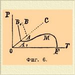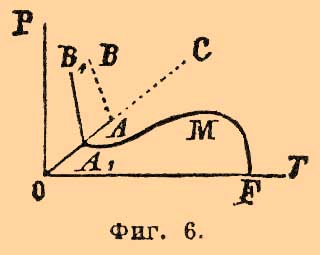 II. Два реагирующих тела. При двух реагирующих телах максимальное число фаз равно 4-м; три фазы образуют моновариантную систему и т. д. Можно различить, по-видимому, два типа, смотря по тому, отсутствует между фазами жидкая фаза или же она имеется налицо. Первый случай (отсутствие жидкой фазы) тесно примыкает к только что разобранным явлениям перемены однородными телами физического состояния. Если пар (или газ), выделяемый данной твердой однородной системой, отличается от нее по химическому составу, то, очевидно, что часть ее претерпевает химическое разложение, продуктами которого являются выделяемый газ и некоторый остаток; газ и остаток являются, таким образом, теми телами, теми независимыми переменными (см. что сказано выше о разложения СаСО 3), из которых может быть построена исходная система. Пока она не вся распалась, мы имеем дело с тремя фазами: исходная система + газ + остаток, иначе говоря — с моновариантной системой, и в ней определенной температуре должно отвечать определенное давление и наоборот, как, напр., при испарении жидкостей. Аналогия идет дальше и в том, что величина давления (при данной температуре) не зависит от отношения между массами исходной системы и твердого продукта распада ее. Сюда могут быть отнесены: диссоциация исландского шпата на окись кальция и углекислоту (Дебрэ, Ле-Шателье; см. Диссоциация), диссоциация солей, с кристаллизационной водой (Дебрэ, Видеман, Лекёр и др.) или кристаллизационным аммиаком (Изамбер) и т. д. (см. соотв. ст.). Во втором случае, когда присутствует жидкая фаза, изменение давления (при постоянной температуре) влечет за собой изменение равновесия, а вместе с тем изменение относительного состава одной (или нескольких) фаз. Представим себе воду при постоянной темп.; достаточно незначительно уменьшить давление, чтобы заставить ее до конца испариться; явление резко меняется, когда в ней растворена какая-нибудь соль, что, как известно, влечет за собой понижение давления пара в зависимости от концентрации соли; если над таким раствором уменьшить на какую-нибудь небольшую, но определенную величину давление, то испарится (при постоянной температуре) уже не вся вода, а только часть ее, и это потому, что по мере испарения воды возрастает концентрация соля и соответственно падает упругость пара раствора; испарение, очевидно, прекратится, когда она (упругость) сравняется с данным давлением. Таким образом состояние равновесия систем, заключающих фазы переменного состава (растворы), находится в зависимости от относительных количеств реагирующих тел в этих фазах, или, иначе, от их концентраций. Эти последние измеряются гораздо легче давлений пара растворов, и потому мы будем пользоваться тут и диаграммами, в которых ординатами будут не давления, а концентрации. Следующие примеры поясняют сказанное. Пусть дан раствор азотнокислого серебра в воде. Четыре фазы в этом случае: твердое AgNO 3, лед, раствор и парообразная Н 2 О [Теоретически можно ожидать, что с паром воды будет и парообразное AgNO 3, но на практике мы можем его считать в данных пределах температуры совершенно не летучим.]; сосуществование их обуславливает безвариантность системы, которой на диаграмме температур и давлений (фиг. 6) отвечает точка А; в ней, как видно, пересекаются четыре кривых, отвечающих четырем возможным моновариантным систем
