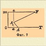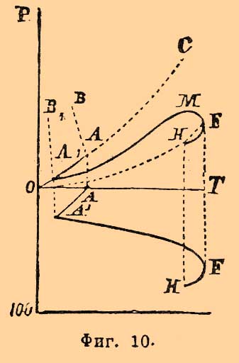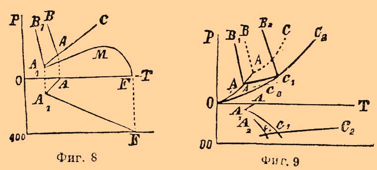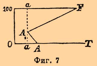 Плошадь CAA1MF обнимает собой область ненасыщенных растворов и пара; она ограничена кривыми: A1MF насыщенных растворов, АС — воды и А 1 А кривой точек плавления льда (выделяемого растворами). Площадь BAA1B1 отвечает области сосуществования ненасыщенных растворов и льда; границами ее являются А 1 В 1 — кривая криогидратных точек (при давлениях больших, чем давление пара криогидратного раствора в точке А 1), AB — кривая понижающихся точек плавления льда с возрастанием давления и кривая А 1 А. Диаграмма ясно показывает: 1) что наименьшей упругостью пара обладают (при любой температуре) насыщенные растворы (см. Растворы); 2) что по мере разжижения их водой (уменьшения концентрации растворенного, нелетучего вешества) упругость их возрастает, приближаясь к упругости пара чистой воды, взятой при той же температуре; 3) что температура выделения из раствора льда (кривая А 1 А) понижается с увеличением концентрации растворенного тела и 4) температура кипения (образования пара определенного давления, равного внешнему давлению, под которым находится система) одновременно возрастает [О законах, которым подчинены депрессии упругостей паров растворов, точек замерения их и т. д. — см. Растворы.]; — но она не дает представления о том, как меняется концентрация насыщенных растворов, а потому естественным дополнением ее служит концентрационно [Под концентрацией соли в данном растворе, согласно Этару, будет подразумеваться количество (весовое) соли в 100 вес. частях раствора (см. Растворы).] температурная диаграмма. Этар нашел, что с повышением температуры азотнокислое серебро растворяется все в меньшем количестве воды и при 198°С (точка плавления AgNOg) становится способным смешиваться с водой во всех отношениях. Если по оси у-ов прямоугольных коорданат откладывать величины концентрации растворов AgNO 3, a по оси х-ов температуры, то, очевидно, кривая [На самом деле он состоит из двух пересекающихся почти прямых линий. Точка пересечения, лежащая при 55°С, отвечает температуре аллотропического изменения AgNO 3. На фиг. 7 для простоты нанесена одна прямая A1F. ] растворимости AgNO 3 должна с повышением температуры, идя слева направо, подниматься и максимальной темп. (абсциссе) 198°С. должна отвечать ордината F (фиг. 7), равная, по условию, 100 (см. примечание).