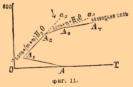 Начиная с криогидратной точки А 1 (состав фаз см. выше), кривая упругости моновариантной системы — CaCl 2.6H2 O + раствор + пар — быстро растет, достигает в M максимума (= 7,02 мм при 28,5°С), вертикально падает в точке F (t = 30,2°, р = 6,699 мм), а в точке Н 1, отвечающей безвариантной системе: СаСl 2.6Н 2 О + СаСl 2.4Н 2 Оβ + раствор + пар, она пересекается с кривой упругости OF сухой СаСl 2.6Н 2 О (Фан'т-Гофф). Нижняя темп.-концентрационная часть диаграммы дополняет верхнюю; значение букв в ней то же, что и в фиг. 7, 8 и 9, так что она не требует дальнейших пояснений. Остальные гидраты СаС 2 (Б. Роозебоом установил еще существование гидратов CaCl 2.4H2O α, CaCl2.2H2 O и CaCI 2.H2 O) повторяют явления, наблюдаемые для CaCl 2.6Н 2 О. В общем ходе их растворимости такой, какой предвидится на основании законности Ле-Шателье (Фан'т-Гоффа) и может быть выражен схематически диаграммой фиг. 11, построенной подобно предыдущим концентрационно-температурным диаграммам.