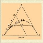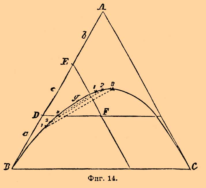 Зато температурно-концентрационные диаграммы на плоскости оказываются невозможными; приходится ограничиться диаграммами, указывающими соотношения между реагирующими телами при какой-нибудь определенной температуре. Если имеем дело с двумя солями и водой, то тогда можно этого достигнуть, относя все растворы к постоянному количеству воды и откладывая по оси х-ов количества одной, а по оси у-ов количества другой из взятых солей (Шрейнемакерс), но безводные соли и системы, содержащие незначительные количества третьего тела, не находят себе места на таких диаграммах. Гораздо удобнее метод, предложенный Левенгерцем и введенный особенно в употребление В. Роозебоомом. Представим себе равносторонний треугольник (фиг. 14), каждая сторона которого разделена на 100 равных частей, и условимся считать, что углы А, В и С отвечают чистым реагирующим телам, и пусть, например, требуется найти точку, отвечающую смеси А, В и С, которая содержит а% 1-го, b% — 2-го и с% третьего тела. Точка А отвечает 100% А, и чтобы нанести на диаграмму а% А, мы должны отложить от угла В линию, равную а; соответственно от А откладываем линию, равную b; расстояние между ними по условию (а + b + с = 100) будет равно с. Если теперь из точки D провести линию, параллельную ВС, а из Е линию, параллельную АС, то точка пересечения их F и будет представлять собой искомую систему.