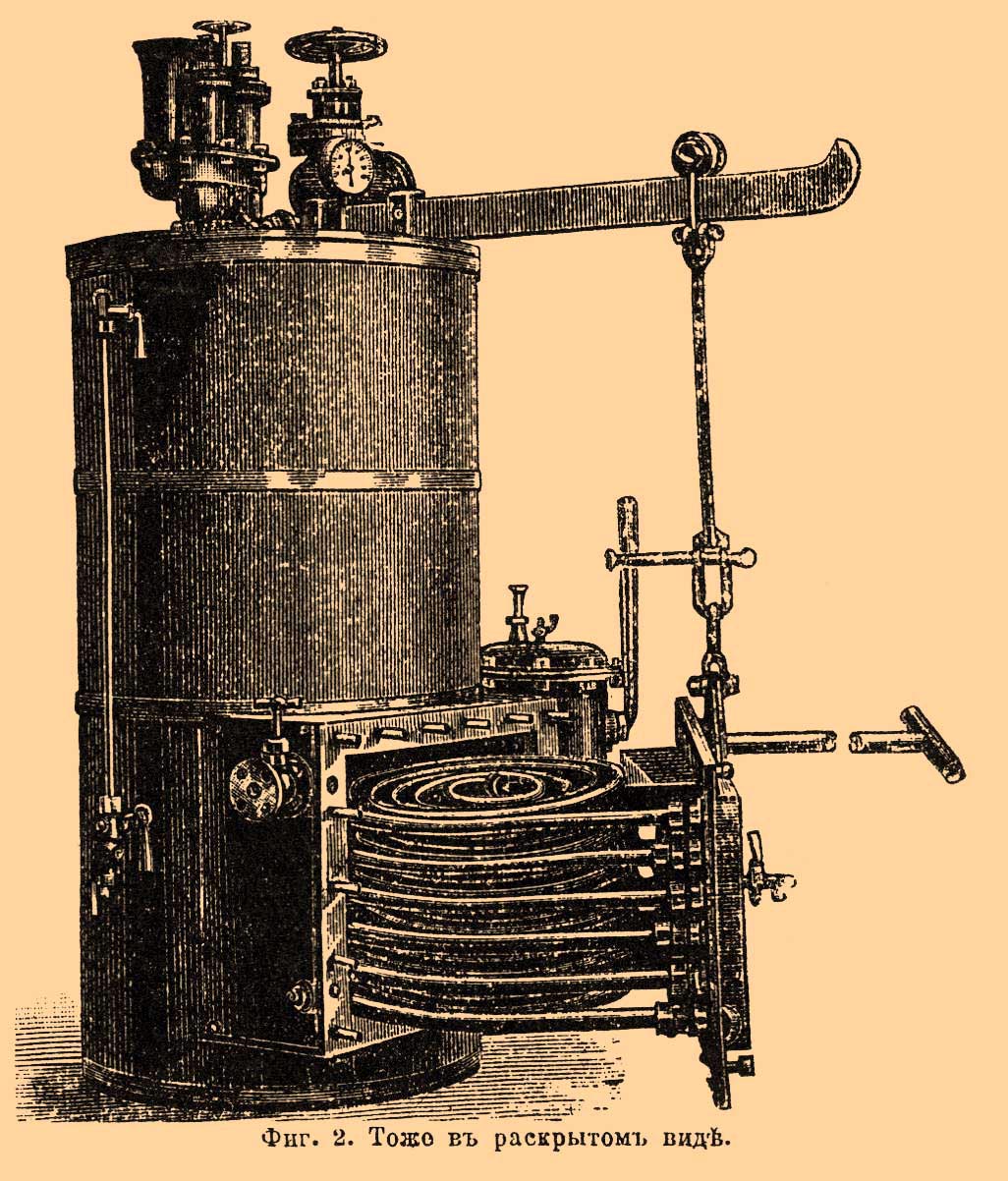 Испарители, опреснители. — П. вода всегда составляла предмет первой необходимости на судах в морском плавании, но, главным образом, лишь для питья. В настоящее время потребление П. воды на новых судах усилилось, благодаря осознанной на практике необходимости питать котлы высокого давления П. водой. Котлы же высокого давления и им соответствующие судовые мамашины тройного расширения пошли в ход вследствие высшей утилизации топлива и меньшего веса, сравнительно с прежними, что и дает возможность или несколько уменьшить мертвый груз современного судна, или увеличить скорость судна. Следующие числа указывают на ход усовершенствования котлов и машин (см. статью Голова в "Морском Сборнике", 1898 г., № 5): до 1860-х гг.: машины развивали от 4½ до 6 индикаторных сил на 1 тонну веса машин и котлов с водой; машины компаунд — 8 инд. сил, с форсированной тягой — 10 инд. сил; машины тройного расширения — 10 инд. сил, с форсированной тягой 15 инд. сил; с водотрубными котлами Бельвиля 11½ инд. сил, на минных судах с форсированной тягой 36—42 инд. силы. Соответственно давление пара повышалось от давления 46—60 фунтов на 1 кв. дюйм, т. е. около 3—4 атмосфер (чтобы получить давление в кг. на кв. стм. нужно число фунтов на кв. дюйм делить на 15,75), превышать которое долгое время не удавалось, в 1880 годах, применяя для постройки котлов мягкую сталь, удалось дойти до 90 фунтов; волнистые топки Фокса дали возможность поднять давление до 125—130 фунтов и, наконец, чтобы с выгодой пользоваться машинами тройного расширения, подняли давление до 160 фунтов. При этом давлении уже сказалось вредное действие соленой воды. Частые случаи порчи котлов, главным образом — выпучивание топок и течь, происходящие от перегревания топок и труб, покрытых большим слоем накипи, стала явлением обычным. Наконец, водотрубные котлы, благодаря своей механической прочности, дали возможность иметь давление 250—300 фунтов, при этом, конечно, нужно было обратить также внимание на питание котлов, так как высокая температура, которой подвергаются трубки котла, в случае образования накипи и задержки циркуляции воды, может вызвать с одной стороны перегорание трубок, а с другой — разложение солей и органических веществ, находящихся в воде, причем продукты разложения, особенно соляная кислота, в короткое время могут совершенно испортить (разъесть) котел. Сильное разъедание трубок произошло, например, во Франции в котле Ориолля, который выдержал всего 1361 час нагрева. Так как пополнять запас П. воды можно не везде и, кроме того, перевозка в цистернах больших количеств воды влечет за собой увеличение водоизмещения и много других неудобств, а всякий вспомогательный котел, испаряющий морскую воду, очевидно, сам еще скорее, чем главный котел, придет в негодность, то ничего больше не оставалось, как ввести так называемый испаритель, т. е. прибор, в котором энергическое испарение забортной воды производится при сравнительно низкой температуре. Это достигается нагреванием забортной воды паром, циркулирующим в медных, сравнительно тонкостенных трубках; при этом, конечно, нельзя перегреть трубки, а большая их теплопроводность способствует усиленному испарению забортной воды. Можно также воспользоваться теплотой уже охладившихся газов, выходящих из котла, но это, с одной стороны, не столь надежно в смысле безопасности прибора