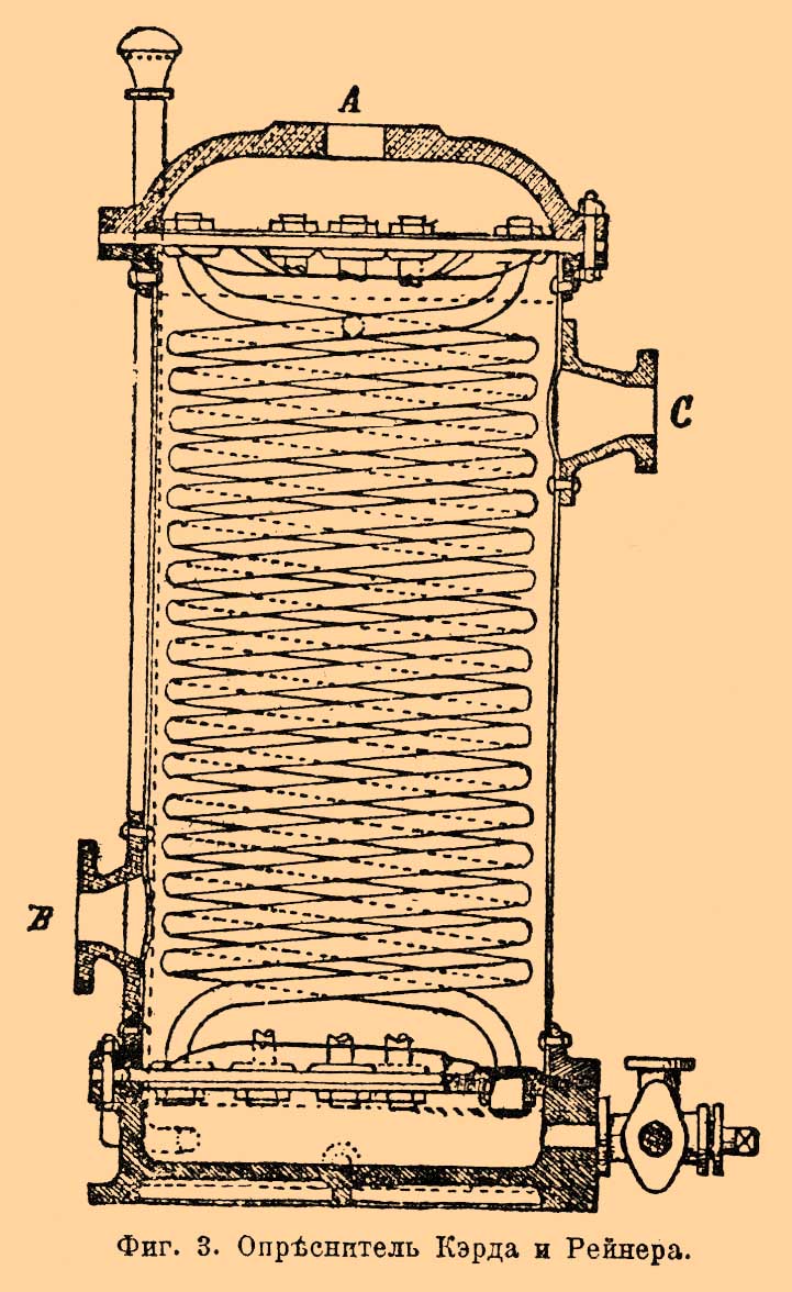 Он состоит из медного корпуса и имеет размеры, например на 1000 инд. сил с производительностью 7½ тонн в сутки: полная высота с клапанами — 6'5"; высота корпуса — 4'11"; диаметр наружный — 2'; диаметр паровой трубы — ¾". Нагревание происходит успешно при давлении входящего пара в 80 фунтов, давлении вторичного от 5"—15" по мановакуметру. Питание испарителя происходит от отливной трубы циркуляционной помпы главной машины, и вторичный пар направляют в холодильник машины, если имеют в виду пополнить убыль в котлах. Если же имеют в виду пополнить запас П. воды, то питают испаритель водой, циркулировавшей в опреснителе. Чистка кипятильника производится через 10—12 дней, если продувание производится почти непрерывно. При продувании впуск пара не прекращают, что весьма способствует очищению трубок от накипи. Опреснитель, изображенный на фиг. 3, представляет собой вертикальный холодильник, в котором вода циркулирует снизу вверх из B в C, а пар из испарителя поступает сверху через A, входит внутрь медного змеевика (из 7 труб), охлаждается и дает воду, которая и собирается на дне.