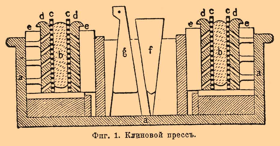 — П. называют механизмы, посредством которых можно подвергать тела значительным давлениям. Нет почти ни одной отрасли промышленности, где бы для той или другой цели не прибегали к П., и сообразно с этим П. служат для производства разнообразнейших работ, как то: 1) для уплотнения вещества, например П. для уплотнения сена, торфа и т. д.; 2) для выжимания жидкостей, например П., применяемые в виноделии, производстве масел, П. для отжимания воды из дрожжей, сыра и т. д.; 3) для изменения формы твердых тел, например П., применяемые в монетном деле, при производстве свинцовых труб и вообще при обработке металлов; 4) для скрепления частей и удержания их на месте, как то: П., применяемые при сваривании, копировальные и переплетные П. и т. д.; 5) для подъема и перемещения тяжелых тел, как, например, домкраты (см.) и подъемные машины (см.). Конструкции П. сообразно с целями, для которых они должны служить, весьма разнообразны, как это видно из уже выше описанных П. — виноградарского (см.), для отжимания масел (см.), дрожжевого (см.), кирпичного (см.), порохового (см.), копировального (см.), каландров (лощильные машины) (см.), переплетного П. (см.), Витвортова П. (см.) и т. д. Независимо от цели, для которой П. применяется, схема П. почти всегда состоит из двух досок, обыкновенно металлических, из которых одна — фундаментная плита — неподвижна, другая — верхняя плита — может быть приближаема к ней, и из механизма, посредством которого на верхнюю плиту может быть произведено сильное давление, передающееся помещенному между плитами телу. Сообразно с применением П. фундаментная плита может заменяться чашками (при отжимании сока, масел) или другими приемниками. Для произведения давления на верхнюю плиту применяются различные механизмы: клинья, винты, рычаги, эксцентры; наиболее распространены П. гидравлические, в которых верхняя плита соединена с поршнем, приводимым в движение давлением воды. Клиновые П., наиболее простые, известны были еще в глубокой древности. Схема клинового П. для отжимания масла из семян изображена на фиг. 1.