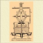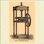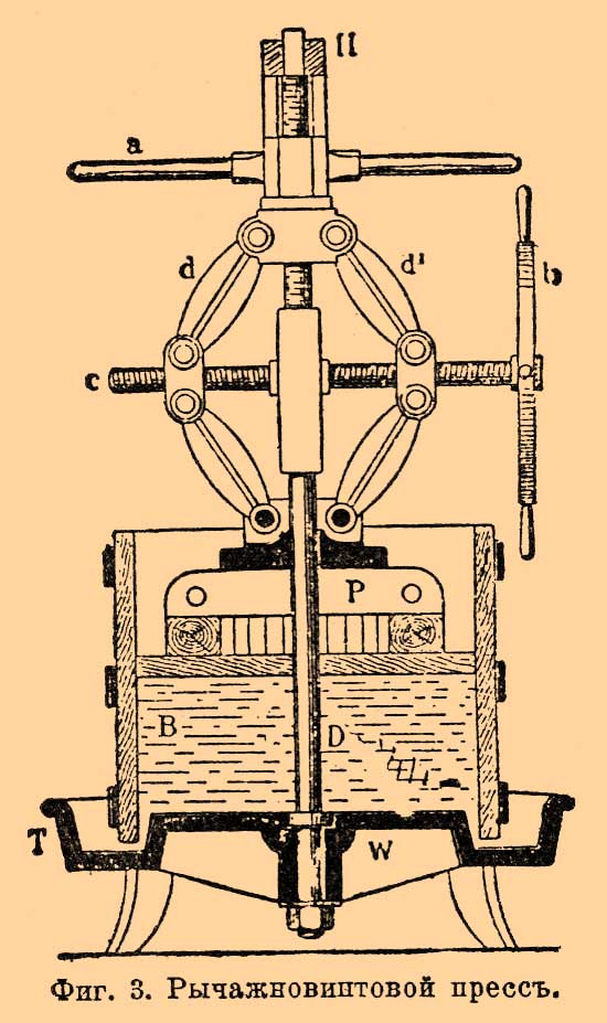 Гайка прорезается во втулке из красной меди или бронзы, вставленной в верхнюю часть корпуса П. На винт насажено маховое колесо, вращаемое от руки или приводом; при вращении винт опускается и нажимает на верхнюю плиту. Часто для увеличения давления присоединяют еще систему зубчатых колес для вращения винта. Так, например, на изображенном (фиг. 2) П., предназначенном для прессования табака, маховик снабжен зубчатым колесом, в которое входит червяковый привод (бесконечный винт), вращаемый маховиком, изображенным справа. Копировальный пресс представляет простой винтовой П. 3) Рычажные П. в простейшем виде состоят из длинного рычага второго рода, к которому недалеко от оси вращения его прикрепляется верхняя плита П.; действуя на длинное плечо рычага грузом или от руки, можно производить давление на верхнюю плиту и находящиеся под ней тела. Значительно более распространены сложные рычажно-винтовые П., предложенные впервые в 1811 г. И. Неведомским в С.-Петербурге для чеканки монет. Схема такого П. для отжимания соков изображена на фиг. 3.