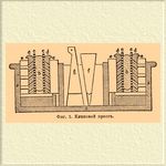 Сжимаемая масса bb помещена в мешках между досок ccdd, из которых крайние неподвижны, средние же прижимаются к bb заколачиванием клина f; масло стекает через отверстия в пластинах c и d. Заколачиванием клина g можно освободить П. от давления и разобрать его части. В настоящее время клиновые П. применяются лишь в кустарной промышленности и почти заменены 2) Винтовыми П. Верхняя плита ходит между четырех железных стоек (фиг. 2); на нее напирает конец винта с плоской нарезкой, изготовляемого обыкновенно из бессемеровской стали.