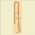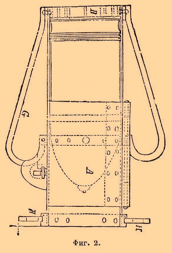 — Лямки (фиг. 5) веревочные с кожаной петлей (1) и крюком (2) служат для накатывания и поднимания лафета в гору — при этом петля надевается прислуге через плечо, а крюком лямка задевается за шайбу, надетую на конец боевой оси лафета.
