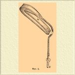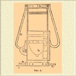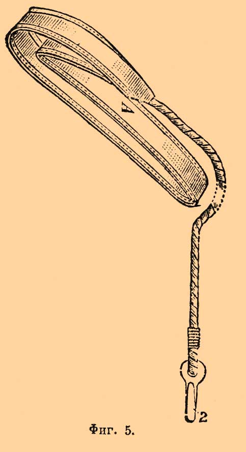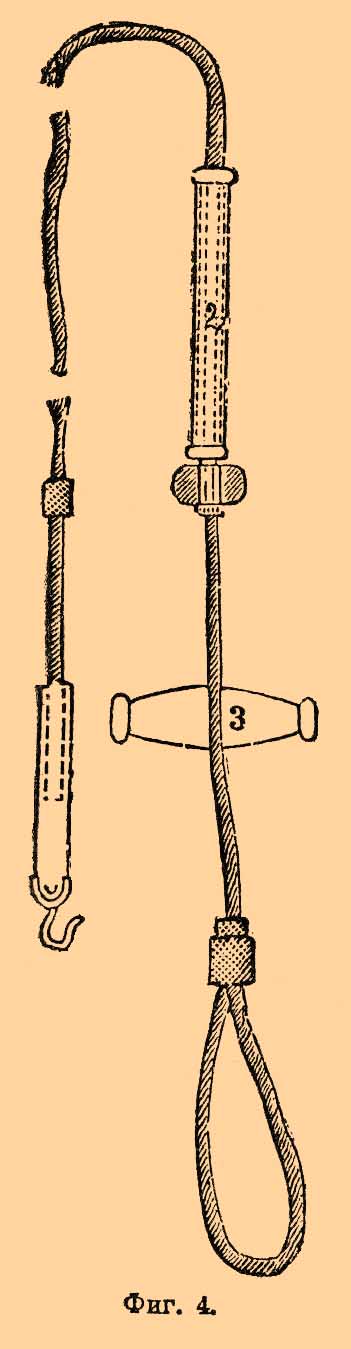 Для помещения снаряда в кокор последний надевают на первый, зажимают винтами (N), ставят на катки и подвозят к орудию; здесь, задев крюком подъемного снарядного крана (при станке) за кольцо (G), поднимают кокор и навешивают на крючья у казенного среза орудия. Снаряды в полевой артиллерии переносятся одним человеком (исключая мортиры, где — двое). Зарядный кокор — цилиндр из листового железа с крышкой и веревочной петлей для переноски — употребляется в крепостной артиллерии для подноски к орудиям зарядов. В полевой артиллерии для этой же цели служат кожаные сумы с крышами и ремнями для одевания через плечо; сумы подбиты холстом. Прибойник (на фиг. 1, цифра 6) служит для досылания снаряда и заряда в камору до определенного места после вкладывания их в канал; он состоит из деревянной колодки — стакана прибойника, насаженного на отдельное древко (в орудиях большого калибра), как в полевых орудиях; прибойник составляет одно целое с колодкой для щетки банника; для снарядов с данным винтом прибойник имеет выдолб. — Трубочник с поясным ремнем, надеваемый одним из орудийной прислуги и служащий для помещения вытяжных трубок. — Прицел (см.) и квадрат (см. Прицеливание) для наводки орудия. Ключ для установки дистанционных трубок; крючок для выдергивания чеки из трубок. — Вытяжной шнур (фиг. 4) с крючком (1), муфтой (2) и костыльком (3) служит для выдергивания терки вытяжной трубки, отчего последняя воспламеняется и производит выстрел, крючком он задевается за ушко терки вытяжной трубки, затем, держа костылек (3) в одной руке, натягивают шнур и, взявшись другой рукой за муфту (2), быстро двигают ее по шнуру и ударяют по упору (4), отчего терка резко вырывается и воспламеняет вытяжную трубку.