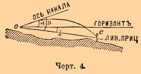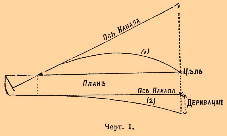 — кривая линия по причине деривации, происходящей при существующем у нас устройстве канала вправо от плоскости стрельбы (вследствие вращений, сообщаемых снаряду) и состоящей в том, что точка падения снаряда уклоняется от плоскости стрельбы на некоторый угол; для попадания в цель дуло оружия должно быть отклонено влево от линии П. настолько, чтобы в проекции на горизонт ось канала составила с линией П. тот же угол. Этот же угол будет составлять плоскость стрельбы с плоскостью П. Последнее достигается устройством прицела: в казне орудия просверлено вертикальное гнездо, куда вставляется стебель прицела, снабженного целиком с прорезью, имеющим возможность перемещаться в направлении, перпендикулярном стеблю и параллельном оси цапф. Отклонив целик влево от нулевой линии П. (см.) на число делений соответственно дистанции, мы тем самым при направлении линии П. в цель отклоним надлежащим образом дуло орудия влево от линии П. Угол, образуемый до выстрела осью оружия (черт. 2, α) с горизонтом, называется углом возвышения; угол β, образуемый до выстрела осью канала с линией П., называется углом П.; угол γ, образуемый линией П. и горизонтом, называется углом местности.