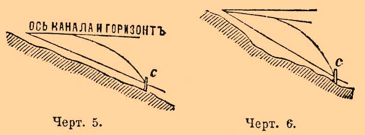 Угол П. можно считать всегда положительным, потому что ось канала всегда выше линии П.; угол возвышения — положителен, когда ось канала направлена выше горизонта оружия, и отрицателен, когда она ниже горизонта; угол местности — положителен, если цель расположена выше горизонта орудия, и отрицателен, если цель ниже горизонта. Между углами возвышения, П. и местности существует постоянная зависимость, а именно: угол возвышения (α) всегда равен алгебраической сумме углов П. (β) и местности (γ). Из рассмотрения черт. 2: α = β + γ; здесь цель C выше горизонта; черт. 3: α = β; здесь γ = 0, потому что и точка вылета, и цели на одном горизонте, т. е. угол местности = 0; черт. 4: α = β +(— γ)= β — γ; здесь цель ниже горизонта, потому γ — отрицателен; черт. 5: α = β +(— γ)= β — γ=0, потому что здесь β = γ, кроме того, прямо из определения угла возвышения следует, что он равен нулю, потому что ось канала совпадает с горизонтом; черт. 6: (—α)=(— β)+(— γ); здесь и цель, и ось канала ниже горизонта, т. е. угол возвышения и угол местности отрицательны.