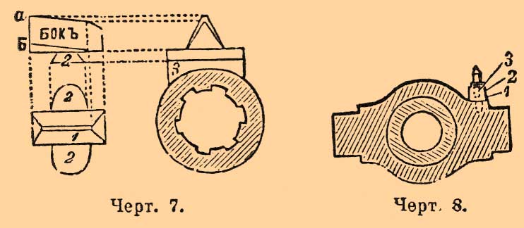 В орудиях к заплечику правой цапфы (черт. 8) прикрепляют винтами железную полку (1), в нее ввинчивают нарезной хвост (2) стальной, цилиндрический, с оживальной головкой мушки; посредине мушка имеет шестигранное утолщение (3) для накладывания ключа при ввинчивании мушки в полку; для удобства наводки вершину мушки спиливают плоскостью; кроме того, мушка чернится. В береговых орудиях средняя, скрепленная часть орудия настолько толста, что закрывает правому прицелу цели, находящиеся левее продолженной оси канала, почему приспосабливают левый прицел и левую мушку. В новейших полевых орудиях, чтобы сделать возможным производство наводки по прицелу во время заряжания орудия, прицельная линия вынесена в сторону на значительное расстояние, что достигнуто помещением прицела в прицельной коробке, привинчиваемой сбоку казенной части орудия, и расположением мушки в полке (1), составляющее одно целое с кольцом (черт. 9(2)), нагнанным с натяжением на ствол орудия около уступа, отделяющего дульную часть.
