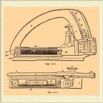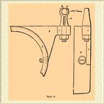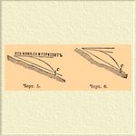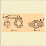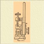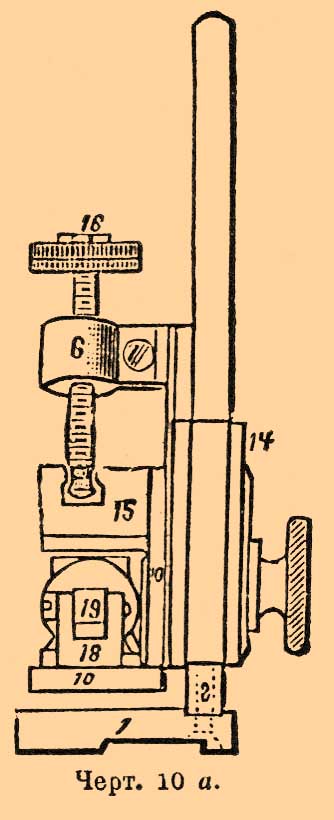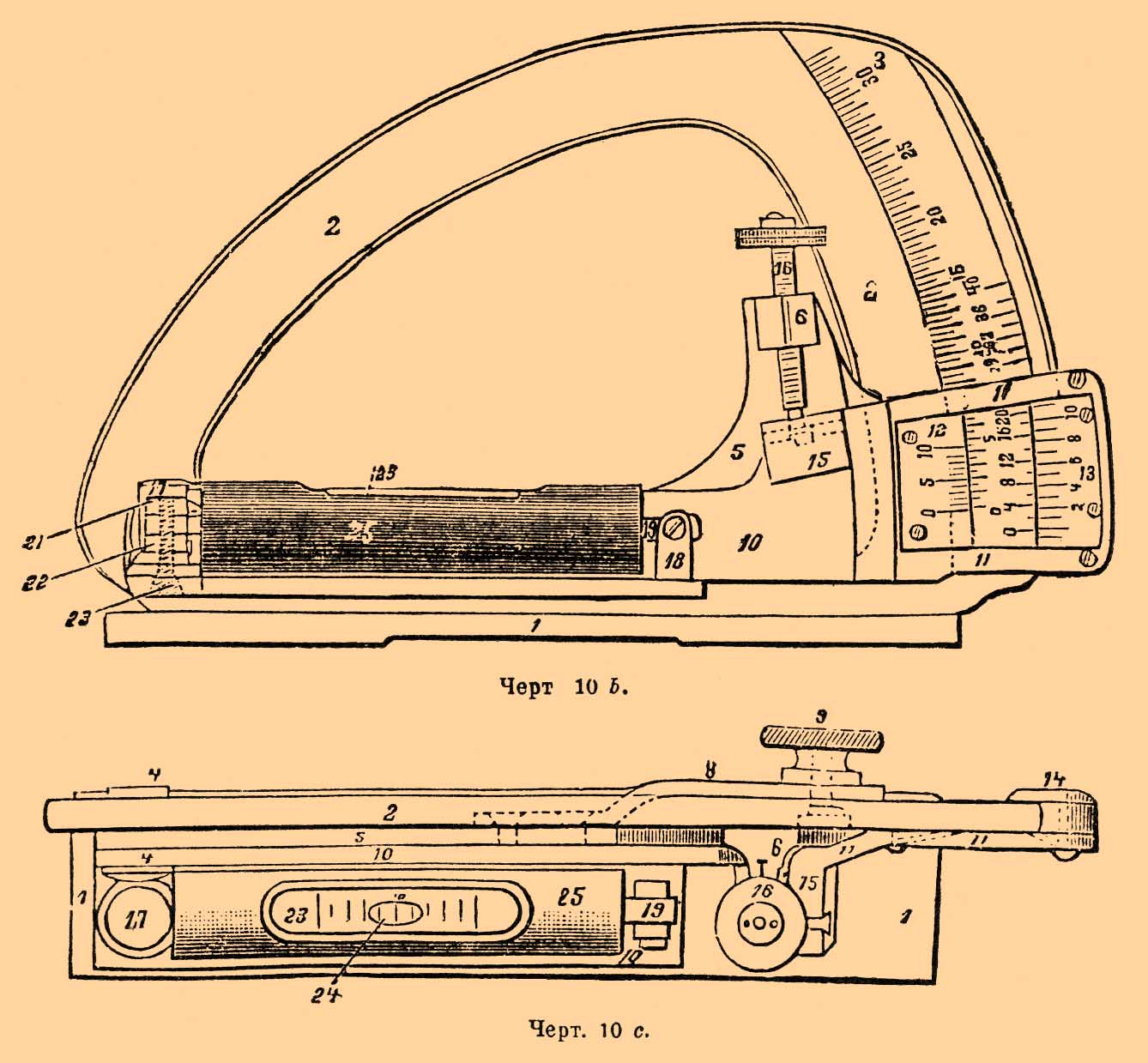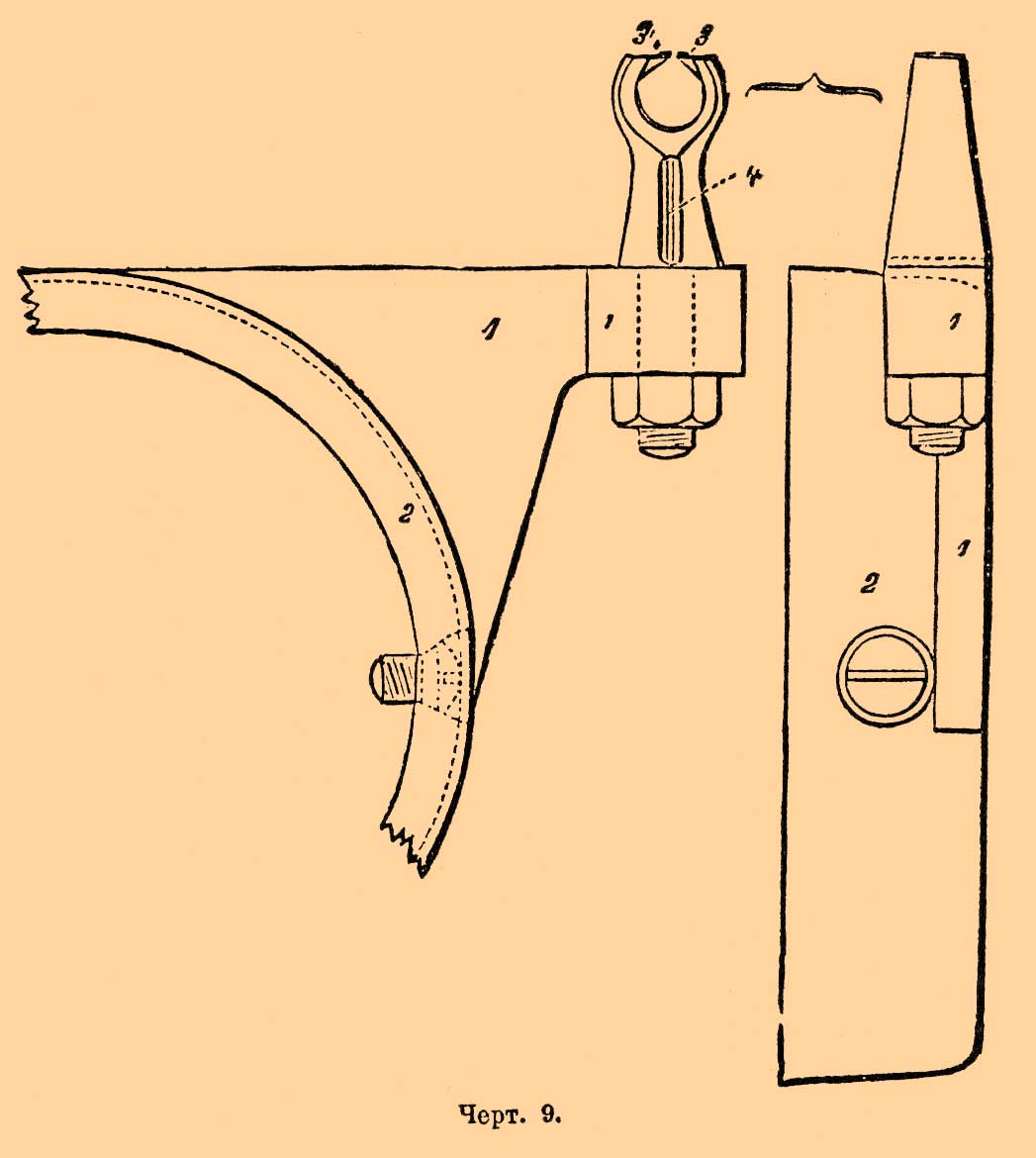 В центре дуги пропущена ось (4), на которую одним концом надета поворотная доска (5), имеющая на другом разрезную матку (6) с зажимным винтиком (7); доска лежит на лицевой стороне дуги, с оборотной стороны которой прилегает нажим (8) с зажимным винтом (9), прикрепленный к доске винтами; с помощью нажима поворотная доска, вращаясь на оси, может быть закреплена в любой точке дуги.