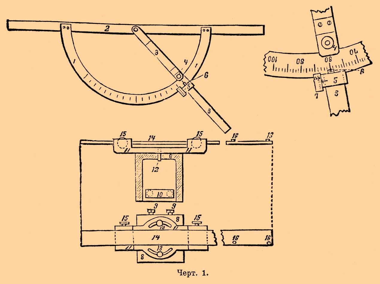 — прибор, употребляемый в крепостной и осадной артиллерии для восстановления и корректирования горизонтальной наводки орудия, произведенной при первом выстреле по прицелу или провешиванием направления на цель и совмещения с ним прицельной линии. Прибор состоит из собственно угломера, базы к угломеру, рытой перед платформой, и двух железных планок, прикрепленных к станинам лафета и станка. Угломер (черт. 1) состоит из дуги (1), разделенной на градусы; к концам ее приклепана стальная линейка (2), на последней в центре дуги укреплена ось, на которой вращается алидада (3), снабженная зажимом (4) и счетчиком (5).