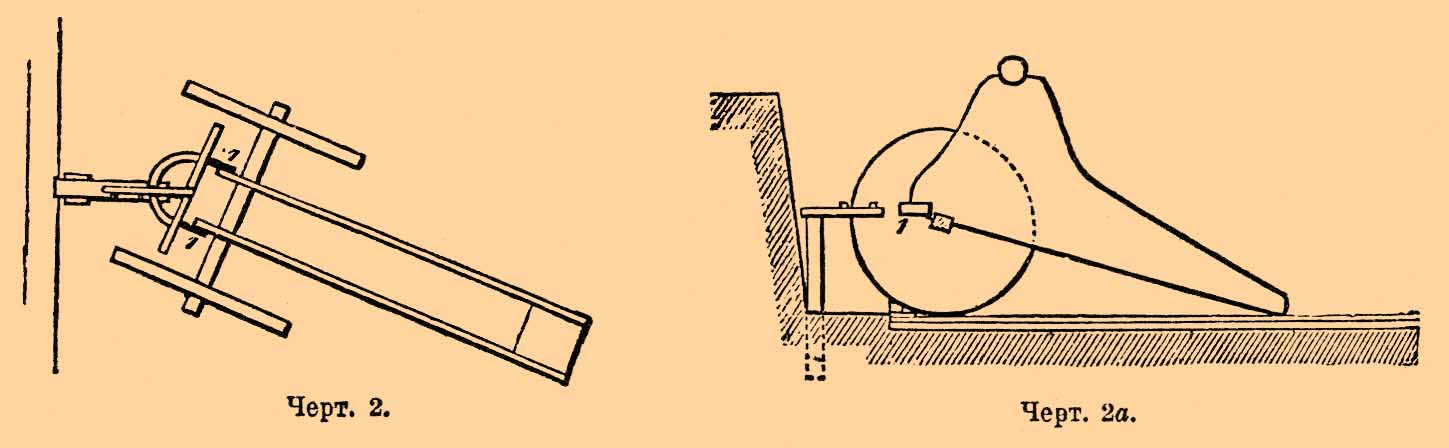 Деления дуги нанесены только в средней ее части от 45° до 135°, в целых градусах, от левой руки к правой. Счетчик служит для отсчитывания минут и состоит из коробки (5), прикрепленной к алидаде, внутри которой помещен ходовой винт с насаженной на него муфтой, оканчивающейся щитком (6), выступающим сквозь продольную щель коробки к делениям дуги; на щитке нанесен указатель — черта; на конце ходового винта заклинен барабанчик (7), по окружности которого нанесены деления, обозначающие минуты; на коробке поставлена черта указатель; при повороте барабанчика на одно деление в ту или другую сторону от указателя щиток (6) переместится соответственно по дуге угломера на одну минуту; целому обороту барабанчика отвечает перемещение щитка на один градус; основное положение счетчика определяется тем, чтобы при совпадении нуля барабанчика с указателем щиток находился на середине длины коробки. Установка алидады производится так: ослабляют зажим, переводят барабанчик из основного положения на скомандованное число минут, передвигают алидаду по дуге угломера, пока указатель щитка совпадает со скомандованным числом целых градусов, и закрепляют зажим. База к угломеру (черт. 1) состоит из чугунной коробки (8), насаживаемой на верхний прямоугольного сечения конец сваи, врытой в землю впереди платформы; коробка удерживается на свае с помощью нажимных винтов (9), надавливающих на железную прилегающую к свае полосу (10). Сверху на коробку накладывается направляющая обойма (11), могущая вращаться около штыря (12), проходящего через отверстия, имеющиеся в коробке и обойме; два винта (13), пропущенные через дугообразные пазы обоймы, закрепляют ее на месте при ввинчивании в коробку; на концах обоймы сделаны пазы в виде ласточкина хвоста для вкладывания стальной линейки (14), которая может быть закреплена неподвижно посредством винтов (15); у одного из концов линейки сверху ввинчены два вертикальных шпенька (16); к ним прикладывается ребро алидады при измерении горизонтального угла поворота орудия. База устанавливается (черт. 2) так, чтобы верхняя плоскость ее линейки приходилась приблизительно на половине высоты передних отвесных ребер планок, прикрепленных к станинам лафета.