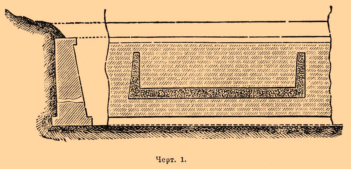 (бреширование) - производство обвалов в каменных одеждах (эскарпах) крепостных верков; для бреширования в современной артиллерии назначаются главным образом 6-дюймовые, облегченные пушки в 120 пудов (относительный заряд крупнозернистого пороха равен 1/10, начальная скорость — 1100 футов в сек.), хотя можно употреблять 42 линейные и 6-дюймовые тяжелые в 190 пудов пушки. Батареи бреширующих пушек располагаются на второй артиллерийской позиции, на расстоянии 300—800 саженей от атакованных верков. Снаряд, снабженный разрывным зарядом, при попадании в постройку производит ударное и разрывное действие. При ударе снаряда в постройку в последней происходит сотрясение, распространяющееся по перпендикулярам к направлению удара; после удара снаряд углубляется в преграду, образуя в ней воронку. Глубина проникания в преграду сплошного снаряда зависит от живой силы (mV2 /2) его, приходящейся на единицу площади поперечного сечения. Вид и размеры воронки от разрывного снаряда зависят от того, насколько он успеет углубиться до момента разрыва: при сопротивлении преграды, допускающем небольшое углубление (каменные одежды), действием разрывного заряда увеличиваются наружные размеры воронки газы разрывного заряда очищают воронку от щебня и таким образом облегчают дальнейшее разрушение. Если каменная постройка не прикрыта земляной насыпью, то ее можно с успехом разрушить стрельбой из нарезных орудий с весьма больших расстояний (более 3 верст); с расстояния около версты прицельно можно даже из полевых пушек разрушить каменную постройку. До Пиобера не существовало определенных правил П. брешей в каменных стенах, почему на эту операцию требовалось иногда несколько недель. Около 1830 г. Пиобер предложил пробивать бреши прицельными выстрелами способом борозд, который заключается в том, что на высоте примерно 1/3 эскарпа пробивали горизонтальную борозду, а по концам ее вверх две вертикальные борозды (черт. 1).