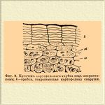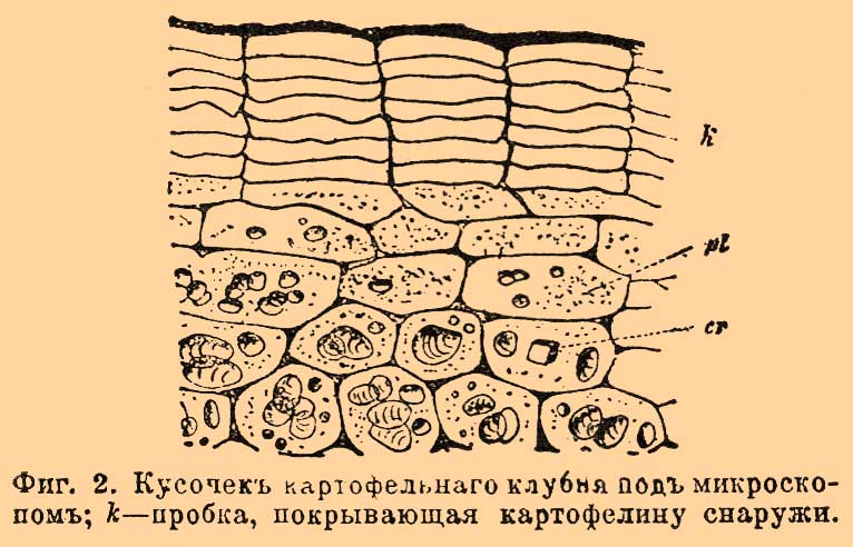 Фиг. 2. Кусочек картофельного клубня под микроскопом; k — пробка, покрывающая картофелину снаружи.