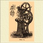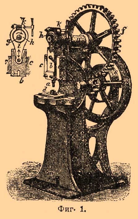 Прорезной штемпель (a) вправлен в салазки (b), которые ходят в неподвижных планках (c) станка вверх и вниз. Под штемпелем на столике лежит кольцо (d). Приводной ремень, ходящий по шкиву (e) махового колеса (l), двигающего посредством шестерни зубчатое колесо (f), горизонтальная ось которого (g) посредством эксцентрика (h) и охватывающего его стержня (i) поднимает и опускает салазки (b) со штемпелем на лежащий на кольце лист, приводит в действие станок. Высота поднимания штемпеля изменяется согласно толщине находящегося в работе металлического листа посредством ручного винта (k), устанавливающего эксцентрик (h). Для моментальной остановки движения штемпеля в то время, когда маховое колесо не разобщено с приводом, служит подножка (m), раздвигающая соединение вала (g) с приводящим его в движение зубчатым колесом (f). Фигура 2 изображает ручную П. машину, употребляющуюся для пробивания дыр в металлических скреплениях при постройке домов и мостов.