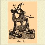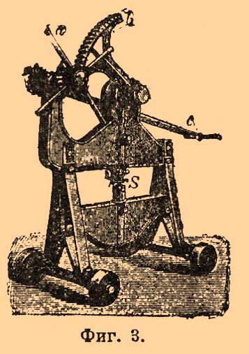 Она стоит на колесиках для удобства передвижения. Пробивает листы до 13 мм толщиной, образуя дыры до 22 мм в поперечнике. Опускание штемпеля производится работником для более тонких листов посредством крестообразного воротила (a) у шестерни, ходящей по отрезку зубчатого колеса (b), опускающему штемпель (S) и нажимающему его на лист. Для более толстых листов давление усиливается посредством рычага (c), при поднимании и опускании которого тормозное колесо у шестерни, движимой воротилом (a), задерживается входящей в него задвижкой. Нередко для прорезания листов употребляются гидравлические прессы (см. Гидравлические П. машины). П. машины для прорезания многих равномерно расположенных на поверхности листа дыр при посредстве автоматического механизма, пододвигающего под штемпель сам лист, называются сверлильными машинами. Часто, в особенности у прорезных машин, приводимых в действие паровой машиной, тот же самый механизм, который служит для движения высекающего кружок штемпеля, приспособлен также для приведения в действие механических ножниц.