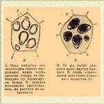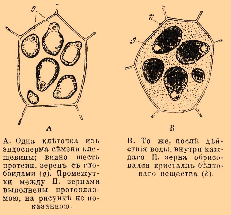 А. Одна клеточка из эндосперма семени клещевины; видно шесть протеиновых зерен с глобоидами (g). Промежутки между П. зернами заполнены протоплазмой, на рисунке не показанной. B. То же, после действия воды, внутри каждого П. зерна обрисовался кристалл белкового вещества (k).