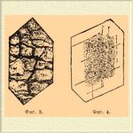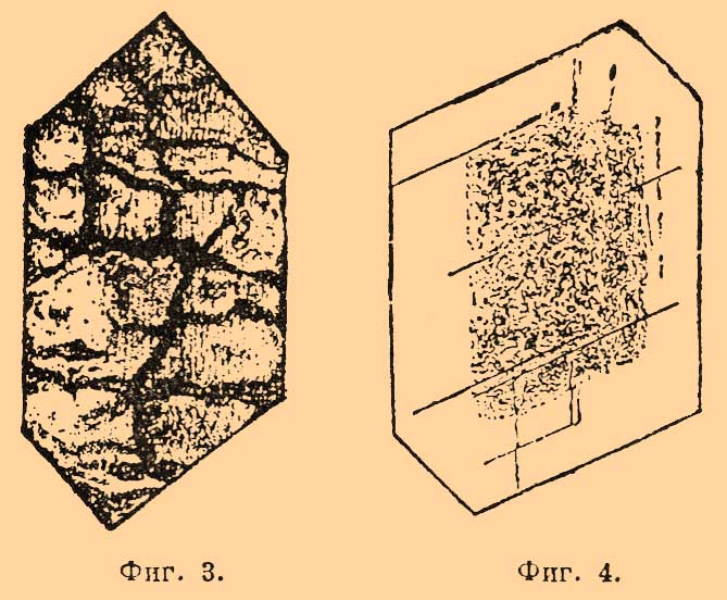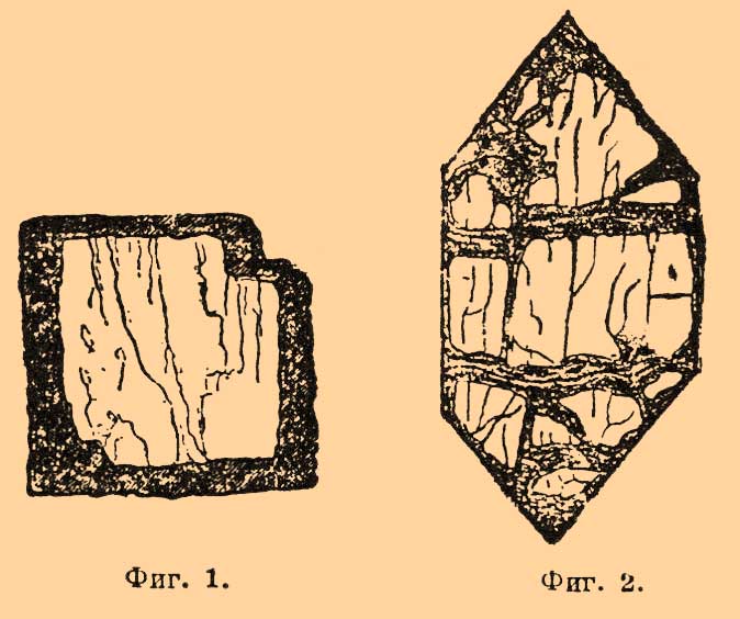 — такие минералы, внешняя форма которых не соответствует их внутреннему строению и, большею частью, их составу и свойствам. Будучи раздроблены, эти минералы распадаются на отдельности, имеющие уже иной кристаллографический габитус. Так, часто в природе встречается бурый железняк (2Fe 2O3 + 3Н 2 О) в виде кубиков пирита (FeS 2) и т. п. По принятой минералогами терминологии, данная П. обозначается так: "бурый железняк по пириту". По способу происхождения П. разделяются на механические и химические. Первые являются в том случае, когда пустота после выщелачивания одного минерала из какой-нибудь горной породы и т. п. была сплошь заполнена другим минералом. При этом, большей частью, такая П. (по Кенготту — "плероморфоза"), по своему химическому составу, не имеет ничего общего с тем минералом, в форму которого она отлилась. Таковы кристаллы кварца (SiO 2) по известковому шпату (СаСО 3), оловянного камня (SnO 2) по ортоклазу (K 2O.Al2O3.6SiO2), халцедона (3SiO 2) по плавиковому шпату (CaF 2) и др. Несравненно чаще встречаются химические П. Под влиянием воздуха, воды и циркулирующих в горных породах растворов в минералах совершаются почти беспрерывно всевозможные химические процессы, ведущие к изменению их состава неполному (П. частичного замещения) или полному (П. вытеснения). При этом может происходить: 1) потеря некоторых составных частей минерала, обыкновенно с уменьшением объема: ангидрит (СаSО 4) по гипсу (CaSO 4 + H2 O), ортоклаз (K 2O.Al2O3.6SiO2) по лейциту (K 2O.Al2O3.4SiO2) и др.; 2) приобретение новых химических элементов, с увеличением объема: гипс по ангидриту, окись железа (Fе 2 О 3) по магнитному железняку (Fе 2 О 3, FeO) и пр.; 3) наичаще двойное разложение: гетит (Fе 2 О 3.Н 2 О) по пириту (FеS 2), бурый железняк по сидериту (Fе 2 CО 3) по следующей реакции: 4FeCO 3 + 3Н 2 О + 2O = 3Fе 2 О 5 + 3Н 2 О + СО 2 и т. п. Самый процесс метаморфизации минерала может идти или от периферии к центру (см. фиг. 1, показывающую превращение гетита в бурый железняк), или по трещинам и плоскостям спайности (фиг. 2 и 3 — превращение оливина в серпентин), или, что реже, от центра к периферии (фиг. 4 представляет кристалл ортоклаза, ядро которого уже превратилось в землистый каолин).