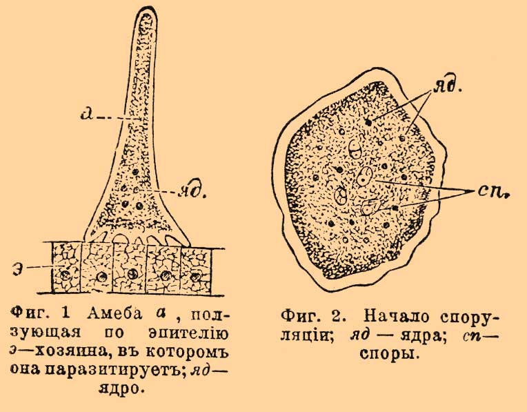 Фиг. 1. Амеба (a), ползающая по эпителию (э) хозяина, в котором она паразитирует; яд — ядро. Фиг. 2. Начало споруляции; яд — ядра; сп — споры.