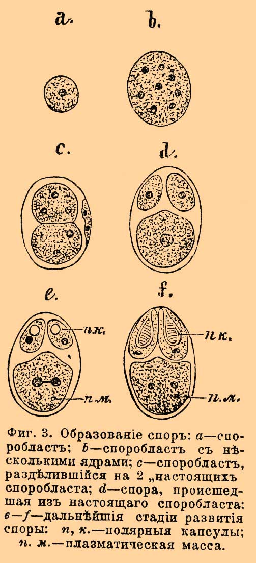 В теле амебы различают наружный более плотный прозрачный слой — эктоплазму, образующую псевдоподии и внутреннюю более жидкую зернистую массу — энтоплазму, в которой заключается много различных продуктов обмена веществ, как, например, жировых зернышек, кристаллов гематоидина (из крови хозяина, в которой живет паразит) и несколько ядер, происшедших делением двух ядер, имеющихся в молодом состоянии амёбы; деление это совершается кариокинетическим путем (см. Протоплазма). Сократительной вакуоли (отличие от настоящих, свободно живущих амёб) нет. Питаясь осмотическим путем за счет соков хозяина, эти амебы растут, и движения их по мере роста становятся медленнее. В продолжение этого роста, даже в ранние периоды его, происходит споруляция, заключающаяся в том, что ядра амёбы окружаются небольшим участком протоплазмы, вокруг которого иногда появляется тонкая оболочка, и образуются так называемые споробласты. Ядро (фиг. 3) каждого споробласта (a) делится, образуя десяток ядер (b), после чего споробласт делится на два "настоящих" споробласта, из коих каждый содержит по три ядра (c), тогда как остальные ядра атрофируются. Каждый "настоящий" споробласт превращается в спору (от 0,004—0,01 мм. длины), причем последняя делится на три части: две так называемые полярные капсулы и плазматическую массу (d), ядро которой вскоре делится на два (e). Вокруг каждой споры, принимающей яйцевидную форму (f), появляется оболочка, причем плазматическая масса со временем дает амебу, а полярные капсулы служат лишь для распространения паразита.