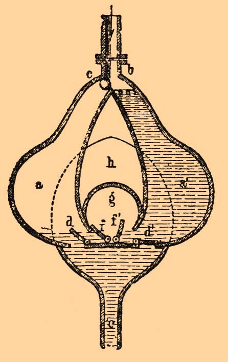 На схематическом чертеже a и a' изображают в вертикальном разрезе оба грушеобразных сосуда П., сообщающиеся вверху с паропроводной трубой b, а внизу с всасывающей трубой e; d, d', f, f' — клапаны, ag — разрез водоподъемной трубы, подымающейся сзади плоскости чертежа и соединяющейся с воздушным регулятором h (см.). В месте соединения паропроводной трубы с горлышками сосудов находится шаровой клапан с, имеющий два седла, чтобы закрывать попеременно вход пару то в правый, то в левый сосуд. Когда a' полон водой, а клапан c закрывает пару доступ в a, давление пара, передаваясь воде, закроет клапан d' откроет клапан f' и начнет вытеснять воду в подъемную трубу g. По мере понижения уровня воды в a', поверхность соприкосновения пара с холодной водой будет возрастать, сначала медленно, потом все быстрее и быстрее. Наступает момент, когда пар станет скорее сгущаться, чем он успевает притекать: тогда давление в устье трубы b станет меньше, чем в сосуде a, шар c перекатится в свое левое положение и закроет горло сосуда a'. Тогда остаток пара сгустится, в а' получится разреженное пространство, клапан f' закроется, и атмосферное давление станет вгонять воду по трубе e, подняв клапан d'. Тем временем пар станет выгонять воду из a, тем же порядком. Остается лишь урегулировать приток пара и ход клапанов так, чтобы вода наполняла один сосуд в то же мгновение, когда почти весь другой сосуд опорожнен. Тогда толчок от остановки движения воды будет способствовать своевременному перемещению шарового клапана c. Чистый пар, без примеси воздуха, мгновенно сгущается от прикосновения холодной воды, а даже малая примесь воздуха сильно замедляет сгущение; поэтому на верху сосудов a и a' устроено по маленькому клапану, отворяющемуся внутрь и впускающему воздух, когда разряжение дойдет до надлежащей величины. Такой же клапан устраивается и на регуляторе h. Чтобы пустить в ход П., надо или налить воды в один из сосудов, через особое для этого предназначенное отверстие, или же пускать и закрывать пар от руки, пока, вследствие его сгущения, не наберется вода сама собой. Многие конструкторы усовершенствовали и видоизменяли устройство П. (Кёртинг, Бонар, Винкельман и др.), пробовали отделять пар от воды гибкой, плохо проводящей тепло каучуковой перепонкой (Гаусман). Существуют П., действующие сжатым воздухом (Лоран, Кестнер); газовые П. имеют с настоящими лишь общее название и представляют самодействующие монтжюсы (см. Свеклосахарное производство).