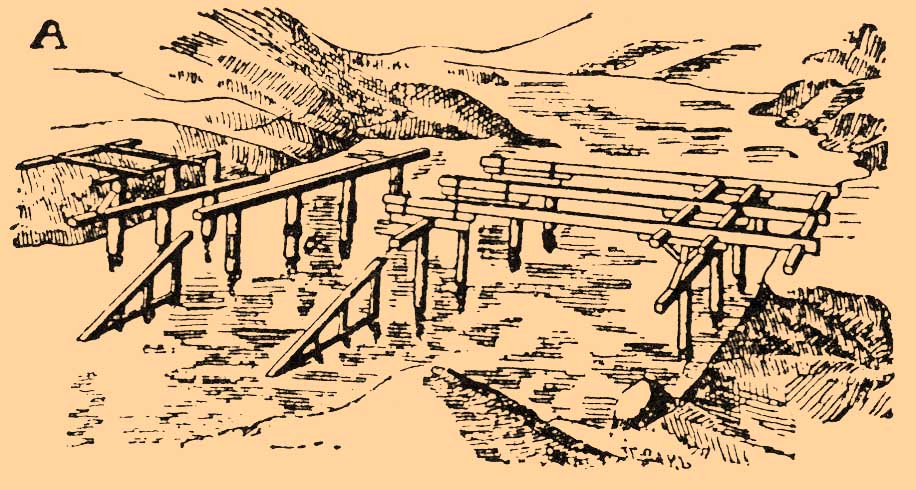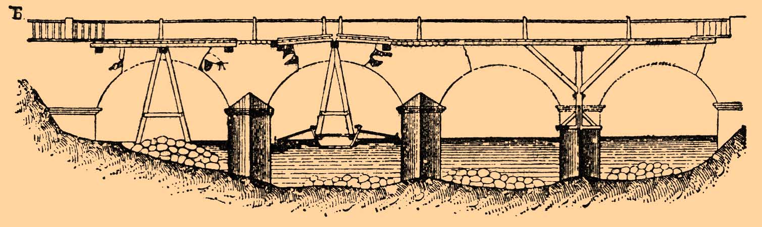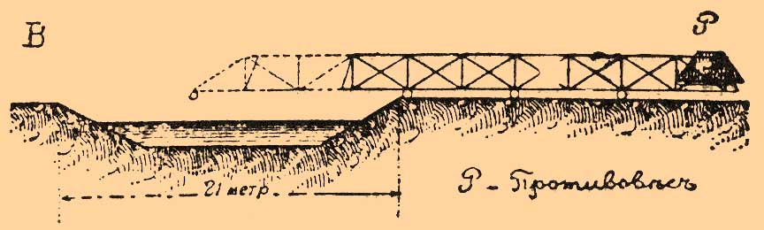 — работы, часто производимые в военное время, когда нужно задержать наступление противника или открыть дорогу для себя. В плавучих мостах разбирают настилку, перерубают главные скрепления, канаты, сплавляют по течению или топят материал устоев; постоянные деревянные мосты сжигают, для чего устои обертывают соломенными канатами или хворостом, на настилке раскладывают костры, ускорив горение керосином и смолой (имея 2 воза соломы на пролет, можно сжечь мост в 40 саж. длиной в 2—6 часов времени); каменные и железные (преимущественно железнодорожные) мосты подготовляют ко взрыву порохом или пироксилином, выделывая пороховые камеры в толще устоев и привязывая пироксилиновые шашки к железным фермам, но производят взрыв лишь в последний момент и не иначе, как по особому приказанию, так как на восстановление таких мостов, если бы они нам самим понадобились, могут уйти многие недели и даже месяцы. Мосты, охраняемые неприятелем, разрушаются артиллерийским огнем с дистанции не более 2—3 вер. или спуском на мост по течению различных тяжелых предметов, зажигательных приспособлений (брандеры) и мин. На рисунках показаны наиболее употребительные приемы восстановления разрушенных мостов деревянных (А — по обгоревшим сваям), каменных (Б — перекрытие взорванных пролетов) и железных (В — при поосредстве разборчатого накатного моста системы Эйфеля).