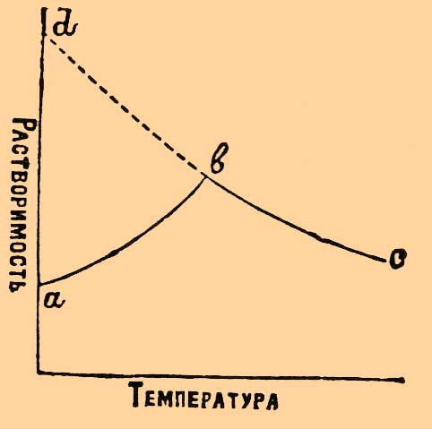 Р., насыщенный в отношении последней фазы, будет сильно пересыщен в отношении двух первых; Р., насыщенный для второй фазы, будет пересыщен для первой и ненасыщен для третьей. Приготовляя Р. с помощью любой из этих фаз, мы получим одни и те же свойства Р. при одинаковой концентрации: различие в величинах растворимости зависит в данном случае от различия состояний вещества вне Р., а не внутри Р.]. При таких условиях одновременное образование из пересыщенного Р. двух твердых фаз невозможно, и если при кристаллизации опустить в Р. одновременно две разности, то та, которой отвечает большая растворимость, исчезает и тело кристаллизуется в разности, которой соответствует меньшая растворимость. Одновременное присутствие в Р. двух твердых фаз дает систему с n +2 фазами (при двух компонентах — четыре фазы: две твердые, жидкая и газообразная). Это система нонвариантая: все четыре фазы наблюдаются при определенных температуре и давлении. Ни нагревание, ни охлаждение не вызывают изменения температуры системы, а лишь исчезание одной из твердых фаз, и, когда одна из твердых фаз исчезнет, наблюдают обычные изменения Р. при одной твердой фазе. Такой случай представляет напр. нагретая до 33° глауберова соль Na 2SO4 10Н 2 O, образующая при этом Р., Na 2SO4 и водяной пар. Все эти четыре фазы могут быть наблюдаемы в одной системе только при 33°; охлаждением системы Na 2SO4 превращает при неизменной температуре в Na 2SO410H2 O, a нагреванием Na 2SO410H2 O в Na 2SO4 при той же температуре (подробности см. Правила фаз). Нонвариантные системы называются также "переходной точкой". В явлениях растворимости "переходная точка" обнаруживается резкой переменой в ходе растворимости, переломом кривой, выражающей зависимость растворимости от температуры, причем каждая из ветвей кривой отвечает особой фазе. Следствием этого может явиться максимум растворимости, если сопоставлять величины растворимости, соответствующие разным фазам. Примером могут служить растворимости глауберовой соли и хлора в воде. Выражением наблюдаемых здесь соотношений может служить прилагаемый схематический чертеж. Здесь максимум растворимости наблюдается потому, что ab отвечает растворимости твердых гидратов (Na 2SO410H2 O) и Сl 210H2 O), образующих Р. с поглощением тепла (восходящая кривая), а bс — отвечает растворимости хлора и Na 2SO4, образующих Р. с выделением тепла (падающая кривая).