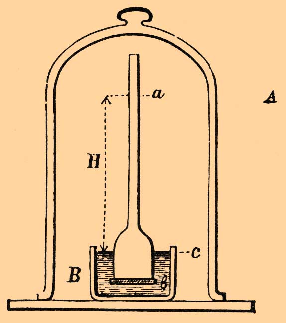 Осмотическое давление и физико-механическая теория Р. Для слабых Р. уже указан ряд правильностей, аналогичных законам газообразного состояния. Одинакова не только форма зависимости свойств от концентрации как в газах, так и в слабых Р.: но кроме того, и влияние природы растворенного вещества здесь по отношению к депрессиям температур замерзания и упругости пара может быть сведено к величине молекулярного веса, как это имеет место по отношению к плотностям газов. Эта аналогия между состоянием веществ в слабых Р. и в газообразном состоянии доведена до высокой степени наглядности путем анализа величины осмотического давления (см. Осмос). Когда Р. заключен в оболочку, проницаемую только для растворителя, и погружен в растворитель, то состояние равновесия наблюдается только в том случае, когда Р. сжат и когда величина производимого на оболочку "осмотического давления" представляет определенную величину; в противном случае крепость Р. или уменьшается, или увеличивается от проницания растворителя к Р. или из Р. Величина этого давления, как показали расчеты Вант-Гоффа, близка к величине газового давления, т. е. к величине давления, которое обнаруживало бы растворенное вещество, если бы оно в том же количестве и в том же объеме находилось в состоянии газа (см. Осмос). Отношение этих величин обозначается через i. Вант-Гофф показал, что i близко к единице, когда растворенное тело обнаруживает нормальные величины "депрессий". Необходимость такого соотношения может быть наглядно показана следующим образом (Аррениус). На фиг. А — сосуд с полупроницаемым (проницаемым только для растворителя) дном b, наполненный раствором, В — сосуд с растворителем.