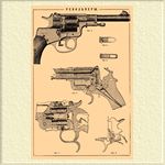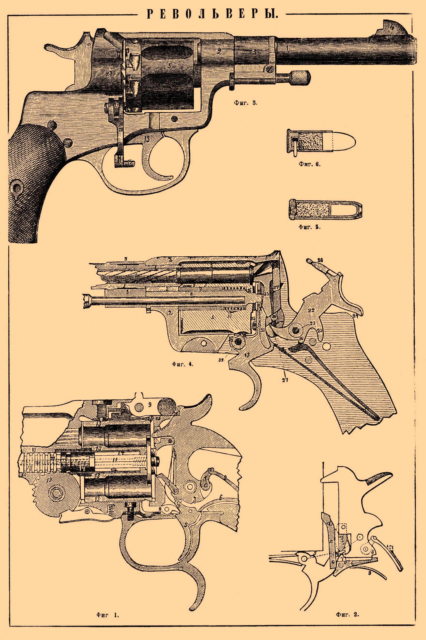 Первые образцы револьверов (капсюльные, системы Кольта) требовали для заряжания насыпания последовательно в каждую камору пороху, досылки шомполом пули и надевания на затравочный стержень капсюля. Лефоше первый предложил Р. (с глухой рамкой) с металлическим, унитарным патроном; гильза патрона заключала порох, пулю и папковый поддон, в углубление которого вставлялся боком капсюль с проходящей в него через стенку гильзы и поддон металлической шпилькой (черт. 6). При заряжании патроны последовательно продвигались в каморы, пустые гильзы выталкивались шомполом. Вследствие выдающихся шпилек патроны Лефоше небезопасны в обращении. Р. системы Смита и Вессона представляет образец с раздвижной рамкой. В револьверах простого действия курок взводится давлением пальца на спицу курка (черт. 1); последний посредством цепочки (1) сцеплен с боевой пружиной (2), закрепленной в рукояти Р.; при взведении курка: в боевой его взвод (3) заскакивает шептало (4) спуска (5), нажимаемое на поверхность курка перкою (6); собачка (7), укрепленная в передней части курка, захватывает концом за зубцы, находящиеся на заднем основании барабана, и поворачивает его на одну камору; зубец барабанной задержки (8) при взведенном курке заскакивает в одно из углублений на боковой поверхности барабана и удерживает его неподвижно. Таким образом, для каждого выстрела необходимо взвести курок за спицу и, нажав на хвост спуска, спустить его. Р. двойного действия предложены с целью ускорить стрельбу — здесь курок взводится давлением на хвост спуска и, поднявшись на определенную высоту, падает, производя выстрел; нажимая вновь на спуск, заставляют курок снова подняться, а барабан повернуться; при падении курка — новый выстрел. Замок этих Р. (чер. 2) снабжен курком, имеющим спереди подвижную собачку (1), нажимаемую постоянно вперед пружинкой. При давлении на хвост спуска его шептало (2), описывая дугу аб, будет нажимать на внутреннюю поверхность собачки и взводить курок, пока шептало не выйдет из-под собачки, что случится в пересечении дуги аб с дугой, описываемой концом собачки; освобожденный курок под давлением боевой пружины (3) бьет по капсюлю и производит выстрел; нажиманием на хвост спуска подается соединенная с ним собачка (4) и поворачивает барабан на один зубец; при высшем положении курка выступ (5) сверху спуска служит барабанною задержкой. Р. двойного действия не допускают меткой стрельбы, потому что курок падает неожиданно и давление на спуск должно быть сильно; эти недостатки устранены в револьверах тройного действия, где взведение курка и поворачивание барабана по желанию может производиться давлением на спуск (скорая стрельба), или давлением на спицу курка с постановкой на боевой взвод (для более удобного прицеливания). Особенности устройства револьверов тройного действия (черт. 2) состоят из второго шептала (6), вращающегося на оси, боевого (7) и предохранительного (8) взводов, нарезанных на нижнем угле курка. При давлении на спицу курка конец шептала (6), побуждаемый перкою (9), заскакивает на предохранительный взвод (8); в это время задержка (5) освобождает барабан (последний можно осматривать и заряжать), от дальнейшего давления на спицу шептало выходит из-под подвижной собачки (1) и заскакивает в боевой взвод (7), удерживая тем курок от падения; замочная задержка и собачка действую