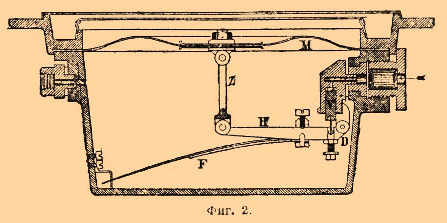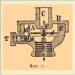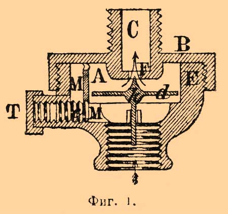 Выходит газ через центральные отверстия F, С в крышке В Р, из которых F почти вполне закрывается коническим придатком k в центре поршня, когда этот последний поднимается под влиянием возрастания давления газа. В толще E стенок Р. сделан канал MA, соединяющий пространство под поршнем с пространством над ним; особым винтиком е можно стеснять сечение этого канала, закрываемого крышкой Т. Таким образом можно всегда урегулировать истечение газа так, чтобы получить хорошее пламя при нормальном давлении, потому что вес поршня так подобран, что он при этом плавает около своего среднего положения. При возрастании давления поршень поднимется, сузит свободное сечение выходного отверстия и уменьшит пламя; при уменьшении давления произойдет обратное. Несколько иного устройства Р. для пользования запасом газа, сильно сжатым в резервуар, для освещения и др. целей, когда требуется выпускать его лишь с небольшим определенным избытком давления против атмосферного. В Р. Пинча для освещения вагонов сжатым светильным газом (фиг. 2) он выпускается предварительно в котелок, закрытый сверху плотной, но гибкой, волнообразно изогнутой крышкою M, через особый клапан F, состоящий из цилиндрической металлической пробки, двигающейся в плотно охватывающем его цилиндре.