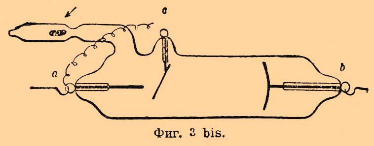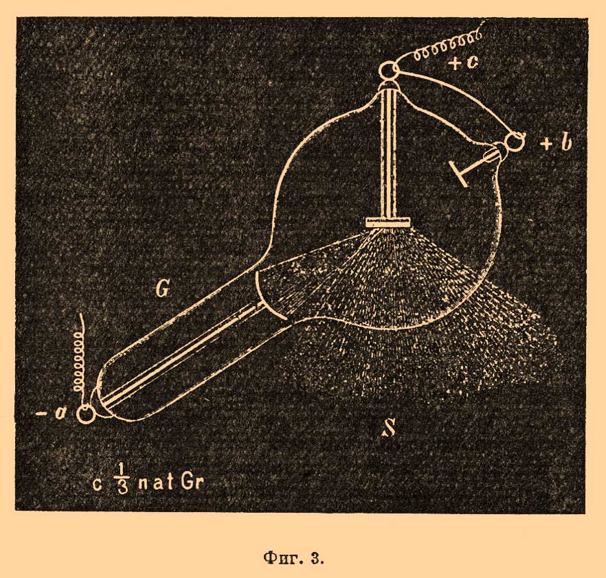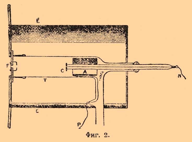 Пучок катодных лучей вызывает на этой пластинке появление светящейся узкой полоски. Когда около трубки помещается магнит, катодные лучи изменяют свое направление, они искривляются, вследствие чего и светящаяся полоска изгибается и принимает вид полоски eg, как это показано на фигуре. Катодные лучи, как это показал Ленард, могут быть выпущены из Круксовой трубки наружу. Для этого необходимо, чтобы катодные лучи в Круксовой трубке падали на очень тонкий листок алюминия, закрывающий собой отверстие в стенке этой трубки. Такой тонкий листок алюминия в состоянии удерживать весьма сильное разрежение в трубке и в то же время он является прозрачным, как это впервые показал Герц, для катодных лучей. Фиг. 2 представляет схематический разрез трубки, устроенной для своих опытов Ленардом.