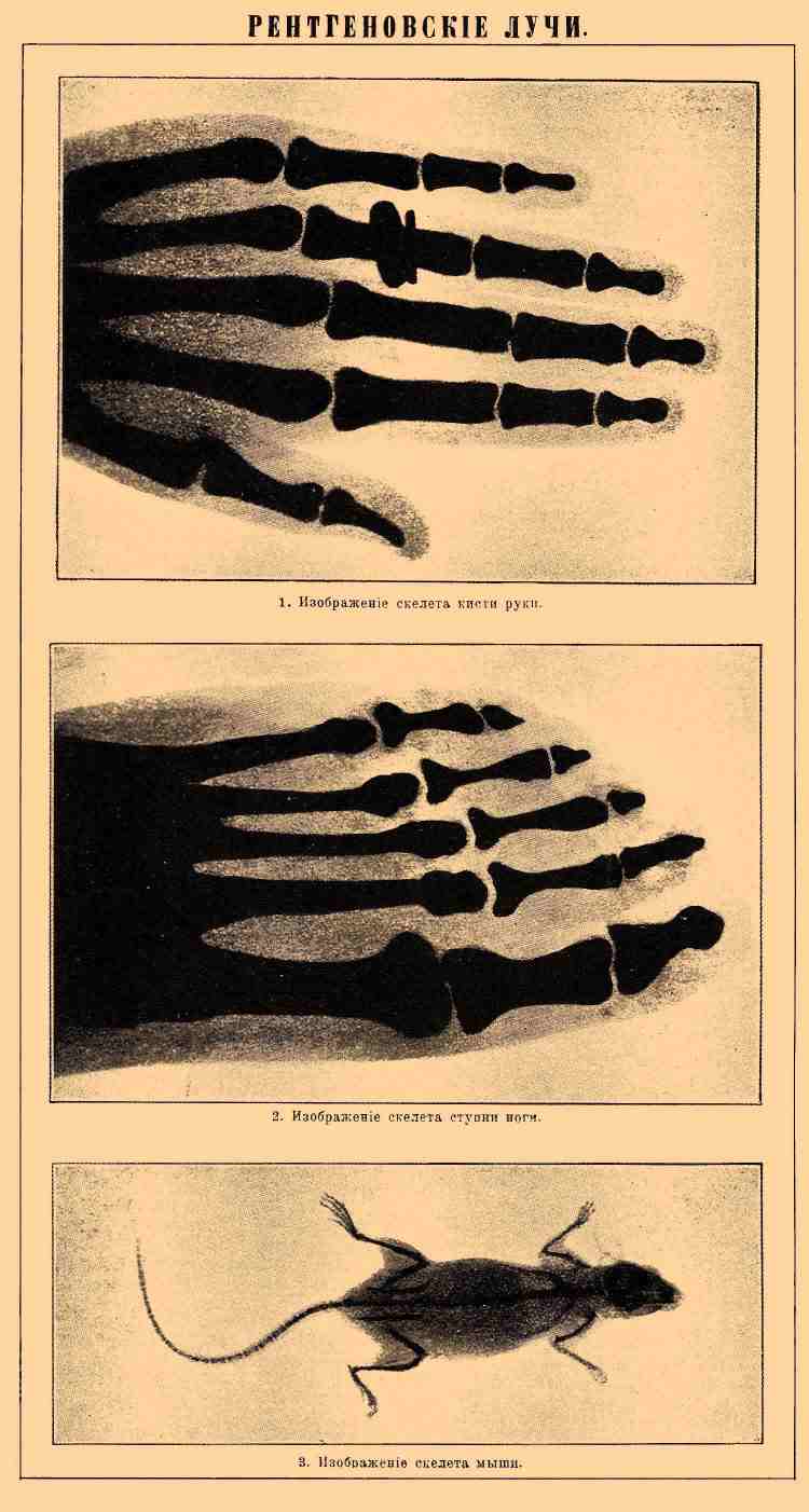 2) В этом явлении, прежде всего, бросается в глаза то, что через футляр из черного картона, не пропускающего никаких видимых или ультрафиолетовых лучей солнечного или электрического света, проходит агент, вызывающий яркую флуоресценцию... Оказывается, что все тела прозрачны для этого агента, но прозрачны в различной степени... Бумага очень прозрачна; за переплетенной книгой в 1000 страниц экран еще заметно светится, типографская краска не представляет чувствительного препятствия. За двумя колодами карт флуоресценция видна: отдельная карта между прибором и экраном почти незаметна для глаза. Листок станиоля (тонкого олова) тоже едва приметен; только когда листки положены друг на друга в несколько слоев, на экране ясно видна их тень. Толстые куски дерева еще прозрачны; еловые доски, толщиной от 2 до 3 стм, поглощают очень мало. Слой алюминия, толщиной в 15 мм, хотя и ослаблял очень заметно действие, но тем не менее не в состоянии был вполне уничтожить флуоресценцию. Толстые доски из рогового каучука, толщиной в несколько сантиметров, еще пропускают лучи (для краткости я буду употреблять выражение лучи, а для отличия от других лучей я назову эти новые лучи X-лучами)... Если между экраном и прибором держать руку, то на экране видна темная тень костей на фоне слабой тени руки...".
